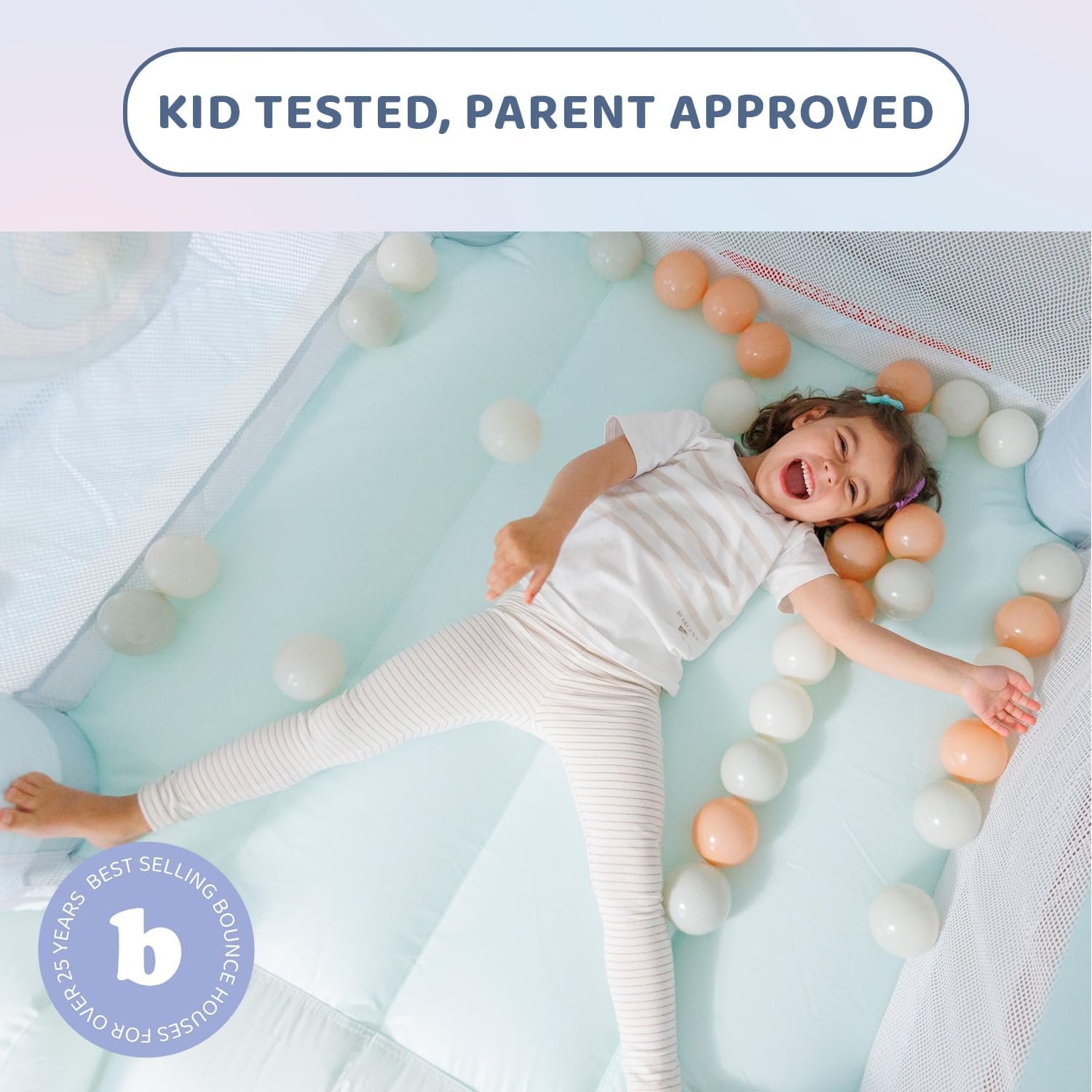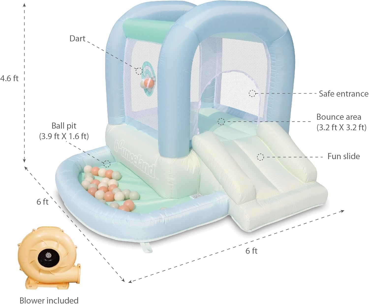 Bounceland Mini Bouncer Mist with Ball Pit, 6ft L x 6ft W x 4.6ft H inflated Size, UL Blower Included, Basketball Hoop, 30 Pastel Plastic Balls, Trendy Bouncer for Kids