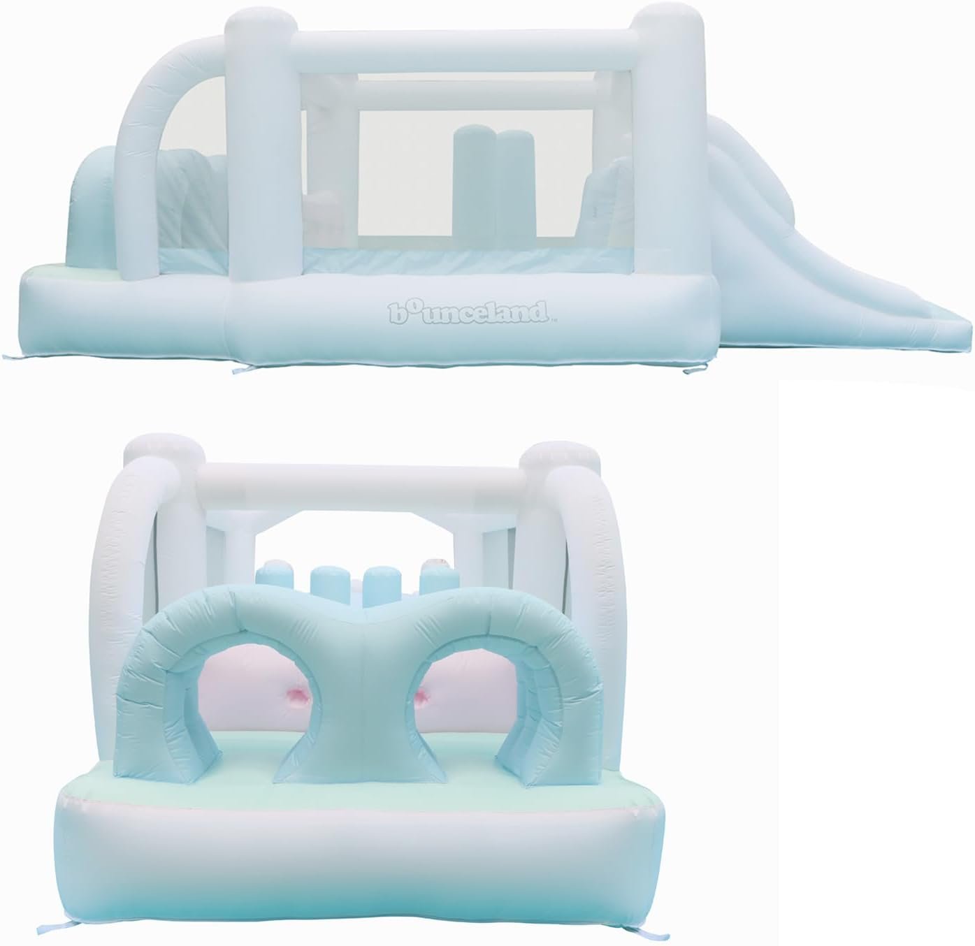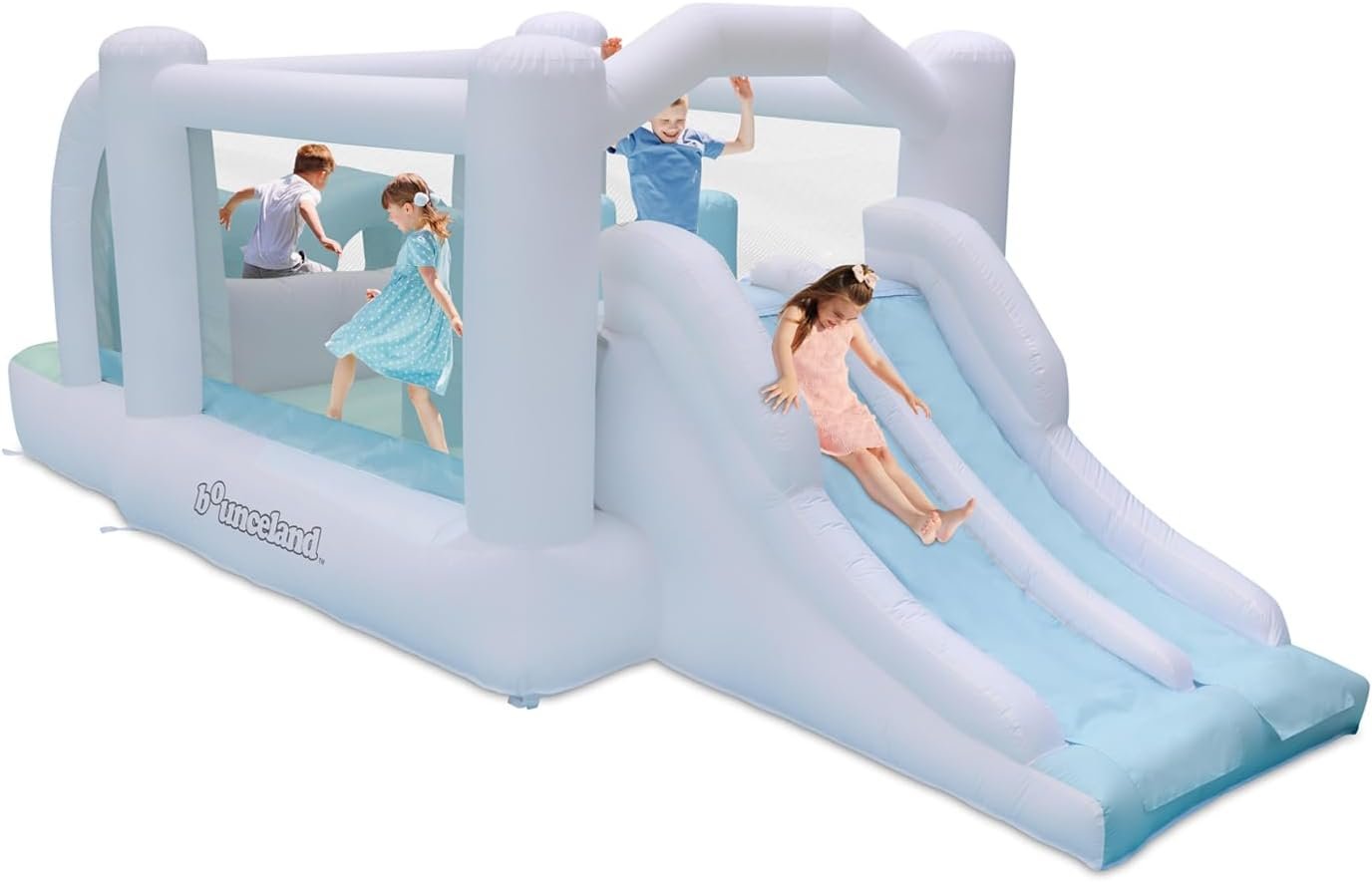 The Bounceland Obstacle Dream Bouncer Combo is an inflatable bounce house measuring 18.5 ft x 8.5 ft x 6 ft, designed for indoor and outdoor play. It includes a blower, carry bag, and repair kit. Accommodating up to four children (max weight 400 lbs), it features dual slides and a durable, puncture-proof design. Safety-tested and certified, it includes a GFCI plug and a 90-day warranty. This bounce house promotes active, social play and helps develop gross motor skills, making it an ideal gift for kids.