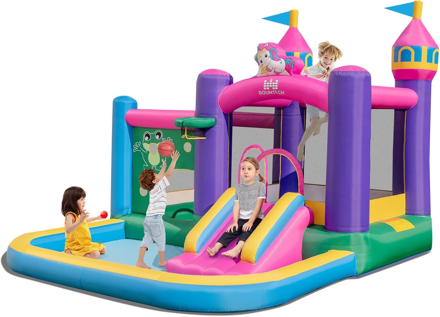 The inflatable bounce house provides children aged 3-10 with an exciting play experience featuring a large jumping area, a smooth slide, a ball pit pool, and a basketball hoop. Made from durable, waterproof 420D Oxford cloth, it prioritizes safety with ventilated mesh walls. Quick to set up in 2 minutes using a blower, it’s easy to store in the included carrying bag. Designed for multiple kids, it has a weight limit of 300 lbs and can accommodate three at a time. Ideal for outdoor fun at parties or in the yard, it creates lasting childhood memories.