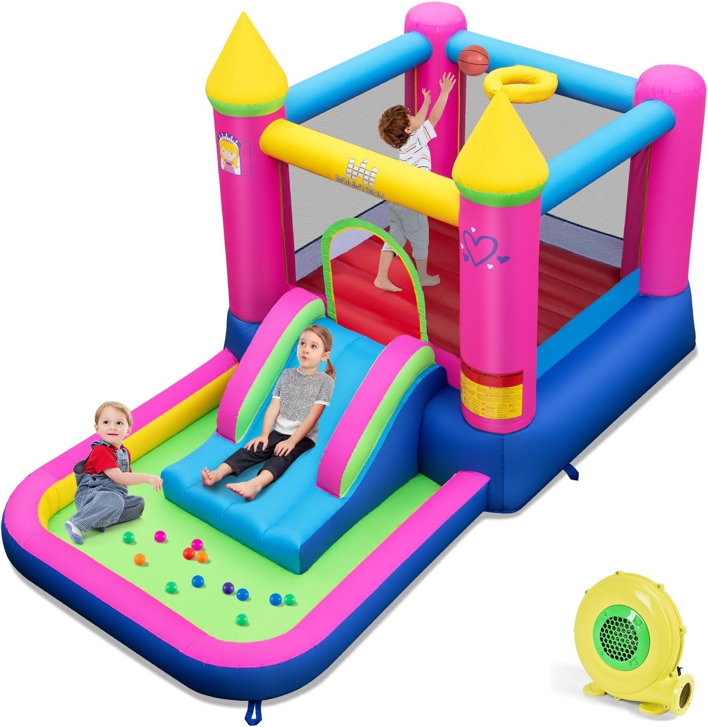Transform any space into a magical playground with our 4-in-1 princess bounce house! Featuring a slide, ball pit, and basketball hoop, it keeps kids engaged and active. Crafted from durable 420D+500D oxford fabric, this inflatable castle includes safety features like mesh walls and cushioned platforms. Suitable for kids aged 3-12, it supports up to 200 lbs and inflates quickly with an included blower. Measuring 143″ x 79.5″ x 81″, it’s perfect for indoor or outdoor fun. Enjoy effortless storage and transport with the handy carrying bag included. Create memorable moments for your little royalty today!