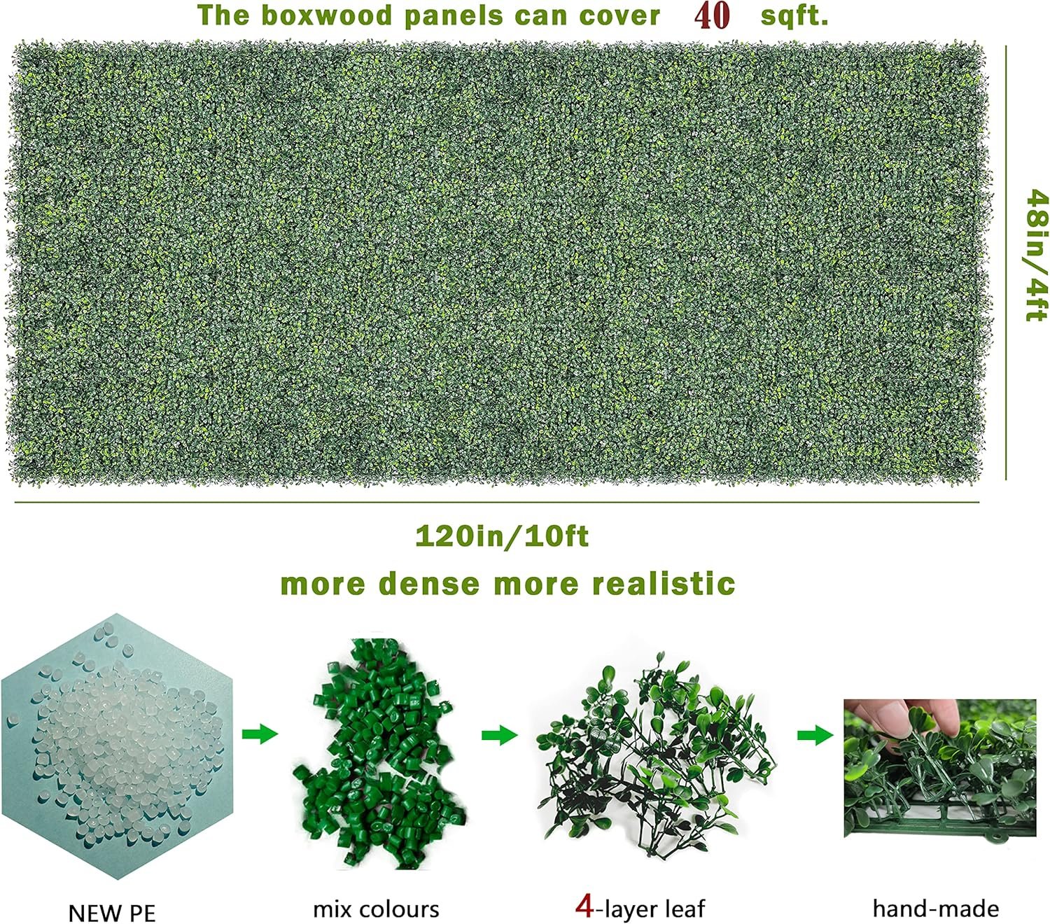 The Bybeton Artificial Grass Wall Panel offers a realistic and dense boxwood hedge effect, suitable for indoor and outdoor use. Measuring 120”L x 48”W, it is lightweight, customizable, and easy to install with interlocking connectors. The panels provide privacy, block UV rays, and enhance decor while ensuring proper ventilation. Made from non-fading, safe polyethylene, they require no maintenance, making them a durable choice for gardens, patios, and interior spaces. Suitable for various settings, the product is designed to last, ensuring aesthetic appeal and functionality without the hassle of traditional gardening.