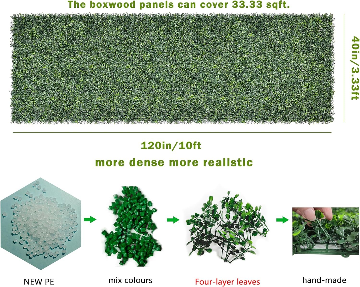 Bybeton offers an artificial grass wall panel featuring dense, realistic boxwood leaves, perfect for indoor and outdoor decor. Lightweight and easy to assemble, it serves as an effective privacy screen and enhances aesthetics for patios, balconies, and gardens. The panels, crafted from durable, fade-resistant polyethylene, require no maintenance and can effectively block light while allowing ventilation. Each panel is modular, facilitating customized arrangements. Established in 2004, Bybeton is a global provider of faux plants, focusing on landscaping solutions and custom designs for diverse environments.