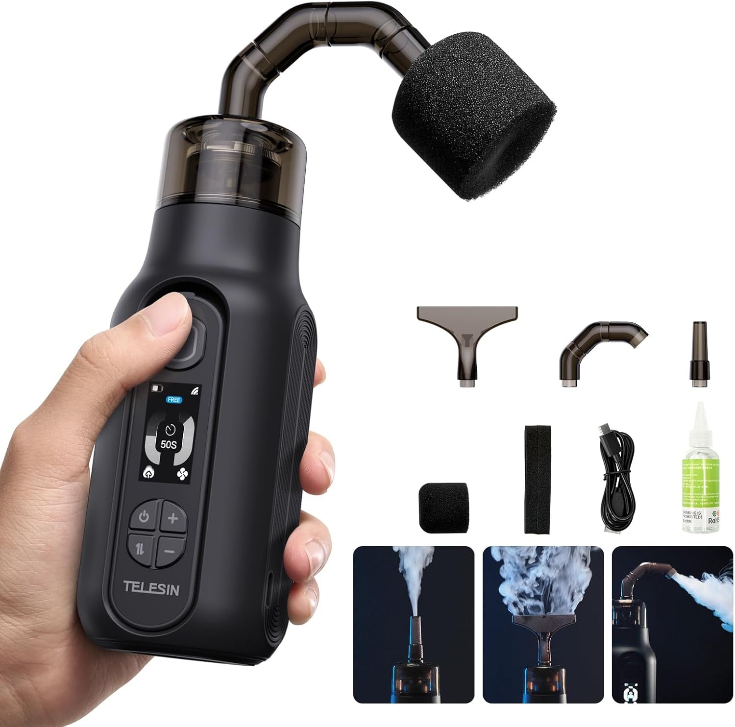The TELESIN° C40 handheld smoke machine is a lightweight, ergonomic tool designed for convenience at outdoor events. It features versatile transparent spraying accessories for different smoke effects and can be operated remotely within 10 meters. Ideal for a variety of scenarios, including photography and events, the C40 allows users to easily adjust smoke output and switch between modes like fog, dry ice, and vapor. The product video demonstrates setups, comparisons, and unpacking, showcasing its ease of use and creative potential.