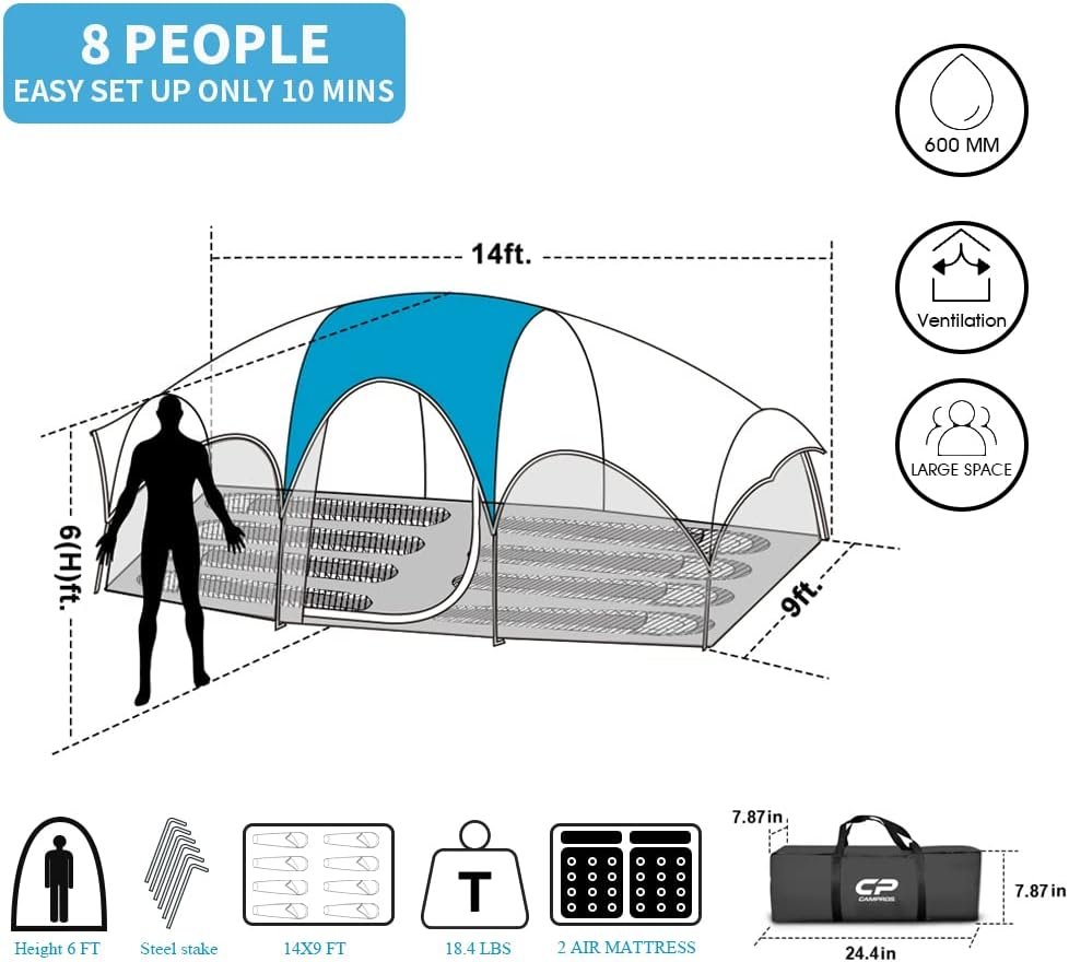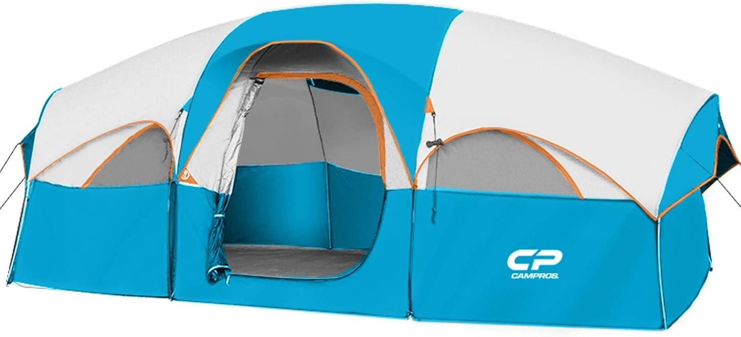 CAMPROS CP Tent 8 Person Camping Tents, Weather Resistant Family Tent, 5 Large Mesh Windows, Double Layer, Divided Curtain for Separated Room, Portable with Carry Bag