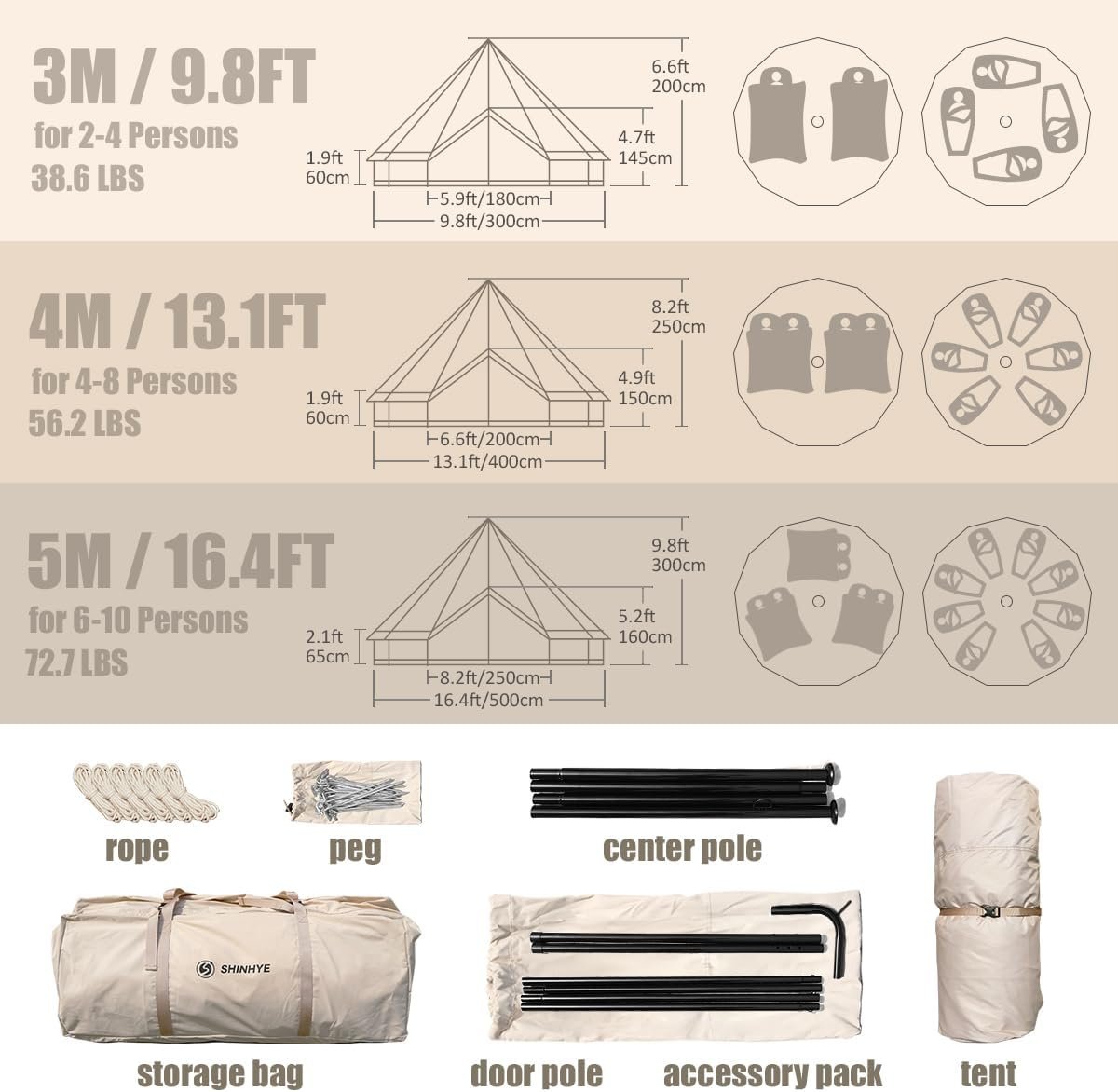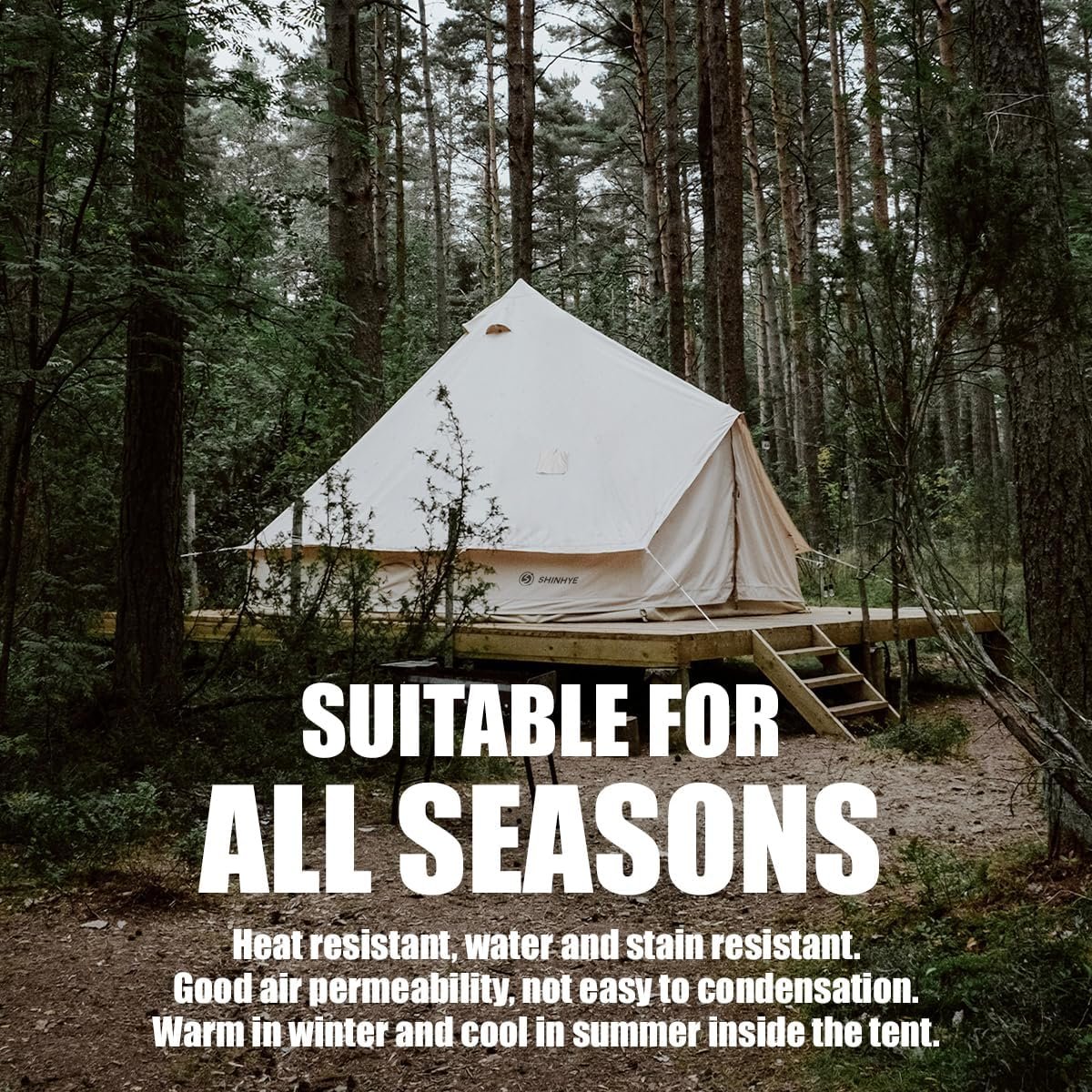 The product features canvas and inflatable tents designed for various outdoor adventures, with prices ranging from $329.99 to $699.99. They are windproof and snowproof, crafted from breathable fabric, and includes options for flame-retardant materials for 4-season camping. The Regatta canvas tent is water-resistant but not fully waterproof. The ShinHye bell tent is spacious, accommodating 2-4 people, and comes with essential accessories like a groundsheet, stove jack, and weatherproof bag. It offers a 12-month warranty, ensuring customer satisfaction and support. User reviews reflect high satisfaction, with many giving 5-star ratings.