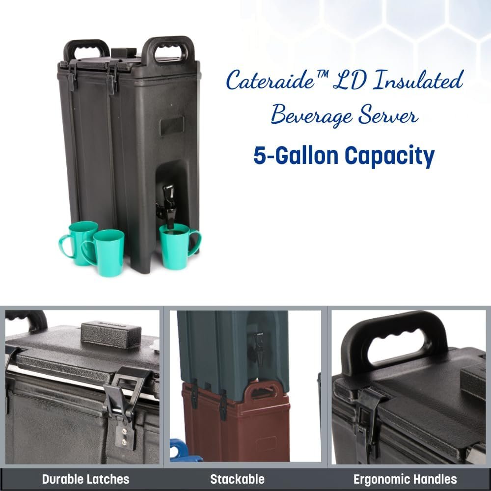 The Carlisle FoodService Products Cateraide Insulated Beverage Dispenser in Black is ideal for catering and restaurants, maintaining beverage temperatures for 4-6 hours. Its dripless service, thanks to spring action faucets and O-ring seals, ensures efficient dispensing. Ergonomic handles allow easy two-person transport, while durable Nylex II latches prevent rust and denting. Renowned for extended hold-times and reliability, it’s NSF Listed and made in the USA, adhering to high quality and safety standards. Model Number – LD500N03.