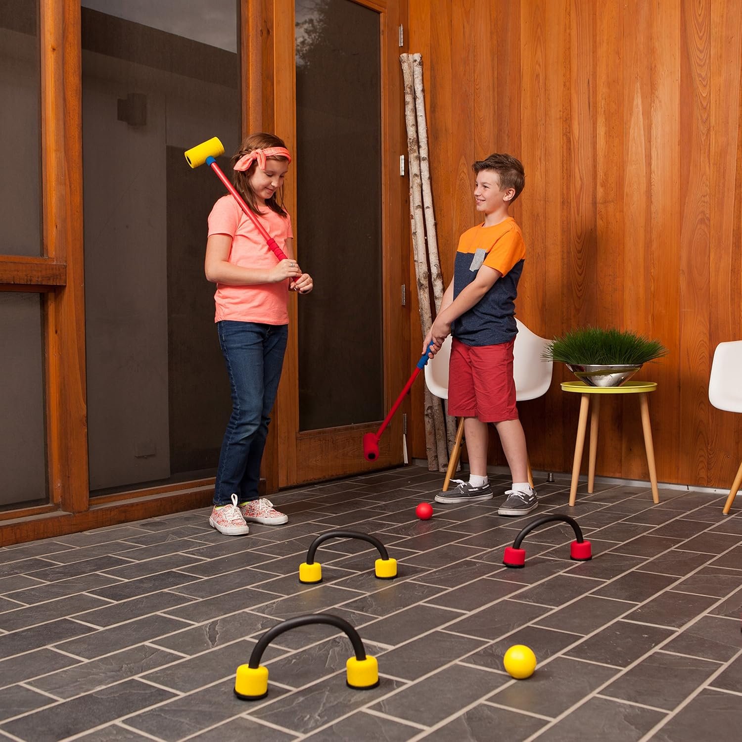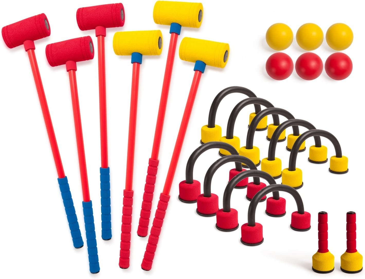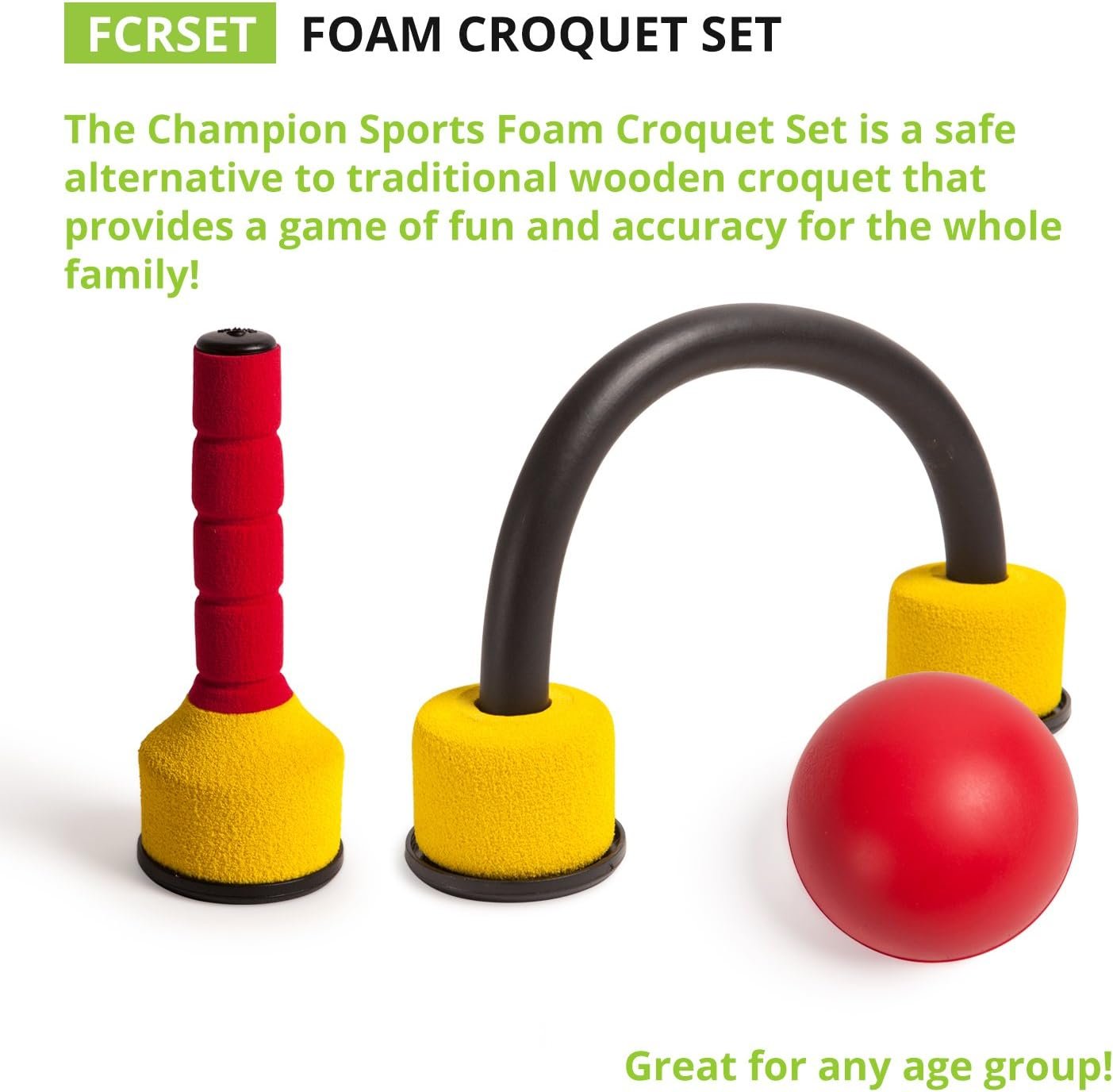 The Champion Sports Foam Croquet Set is a vibrant 23-piece collection designed for all ages, featuring soft, BPA-free foam mallets, balls, wickets, and stakes. This safe and fun set allows kids to enjoy competitive croquet indoors or outdoors without worry. It promotes motor skills and hand-eye coordination while ensuring a worry-free playing experience. Ideal for picnics, barbecues, and family gatherings, it comes with a convenient storage bag for easy transport. Perfect for hours of entertainment, this croquet set is suitable for both boys and girls.