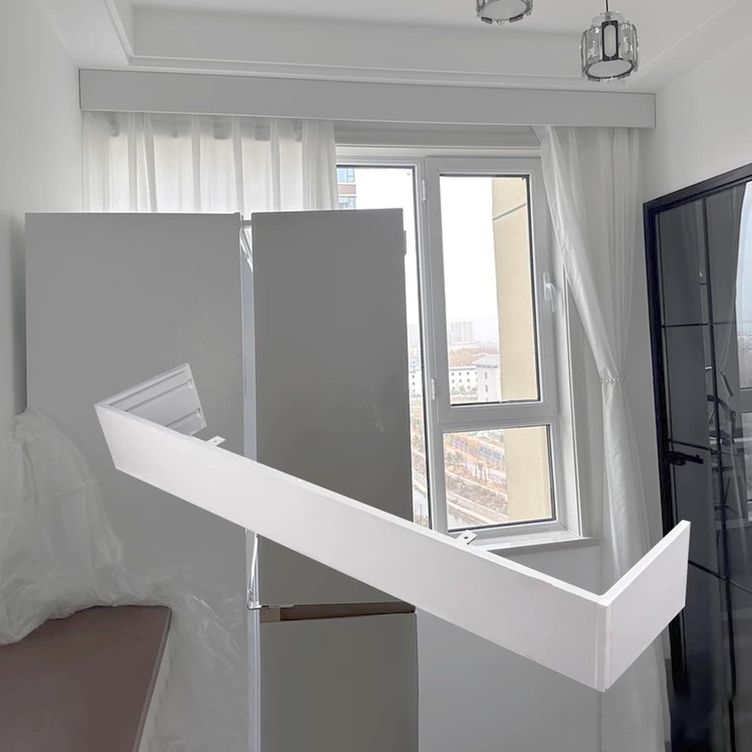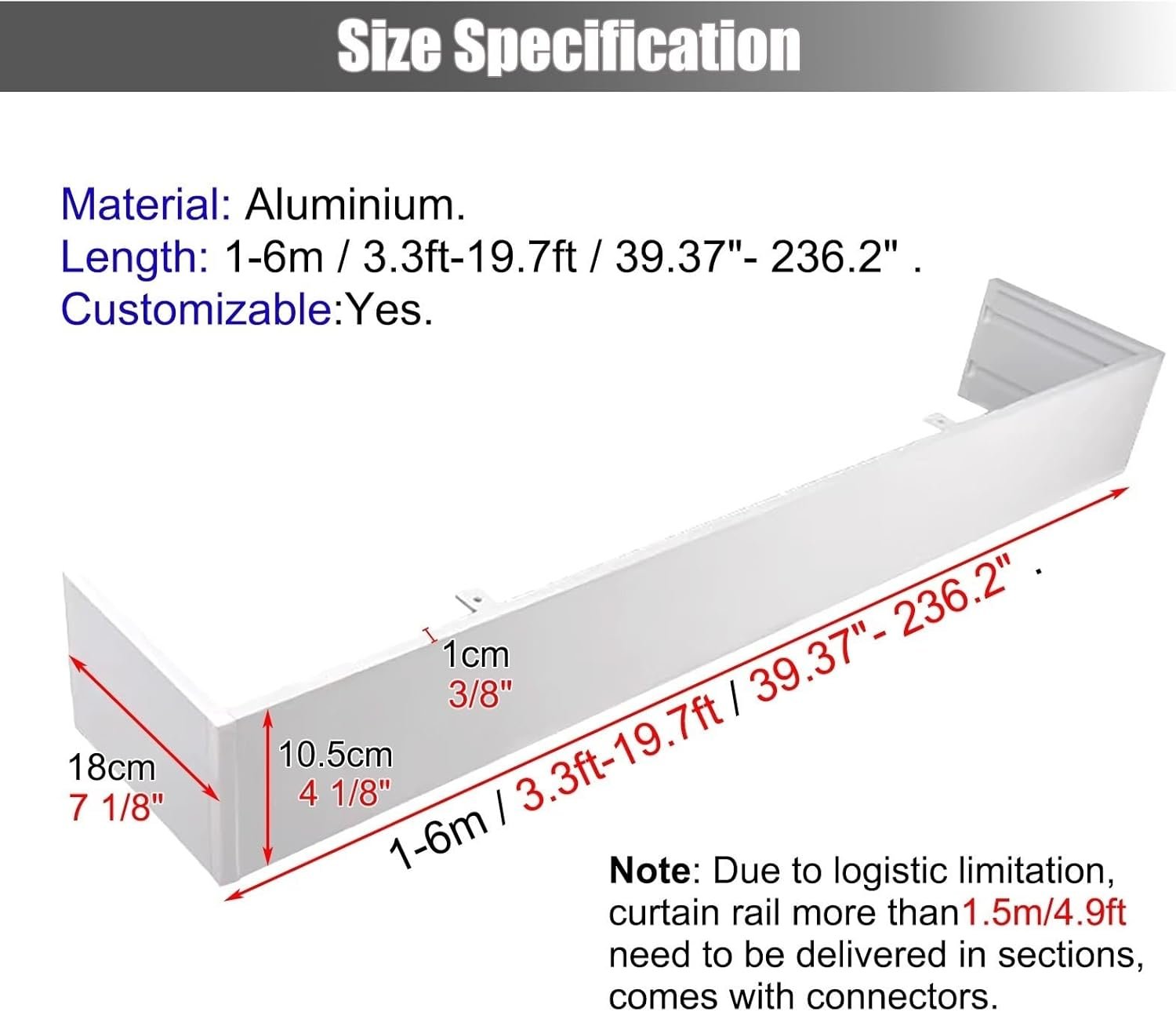The curtain panel effectively covers rods or tracks, enhancing room blackout and privacy. Made from durable aluminum alloy, it is customizable in length and easy to install. With a height of 14cm (5.5 inches), it suits various indoor spaces like living rooms and bedrooms. The package includes all necessary accessories for installation. Note that sections longer than 1.5m (4.9ft) will be delivered separately, but connections will function normally. Customer service is available for inquiries to ensure satisfaction.