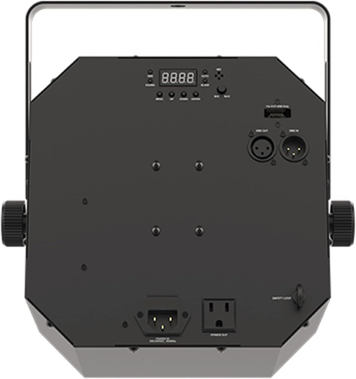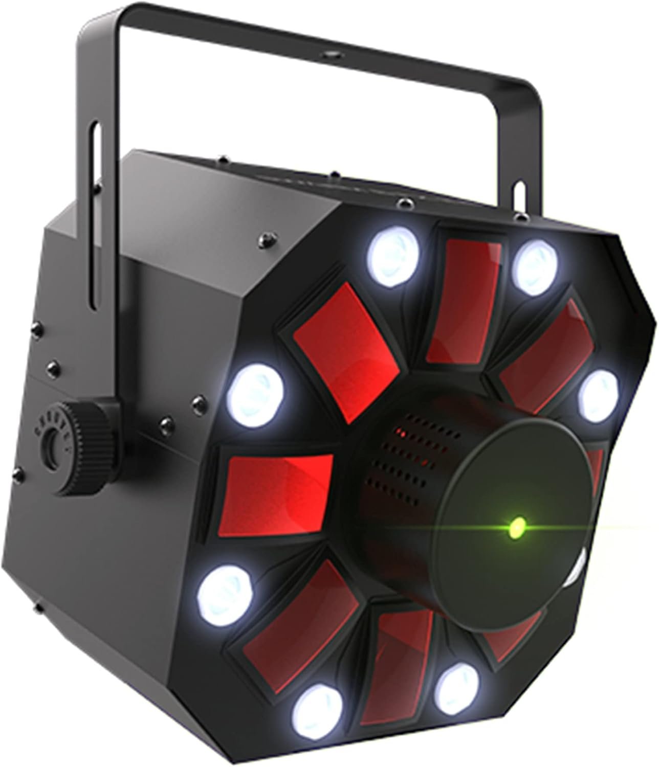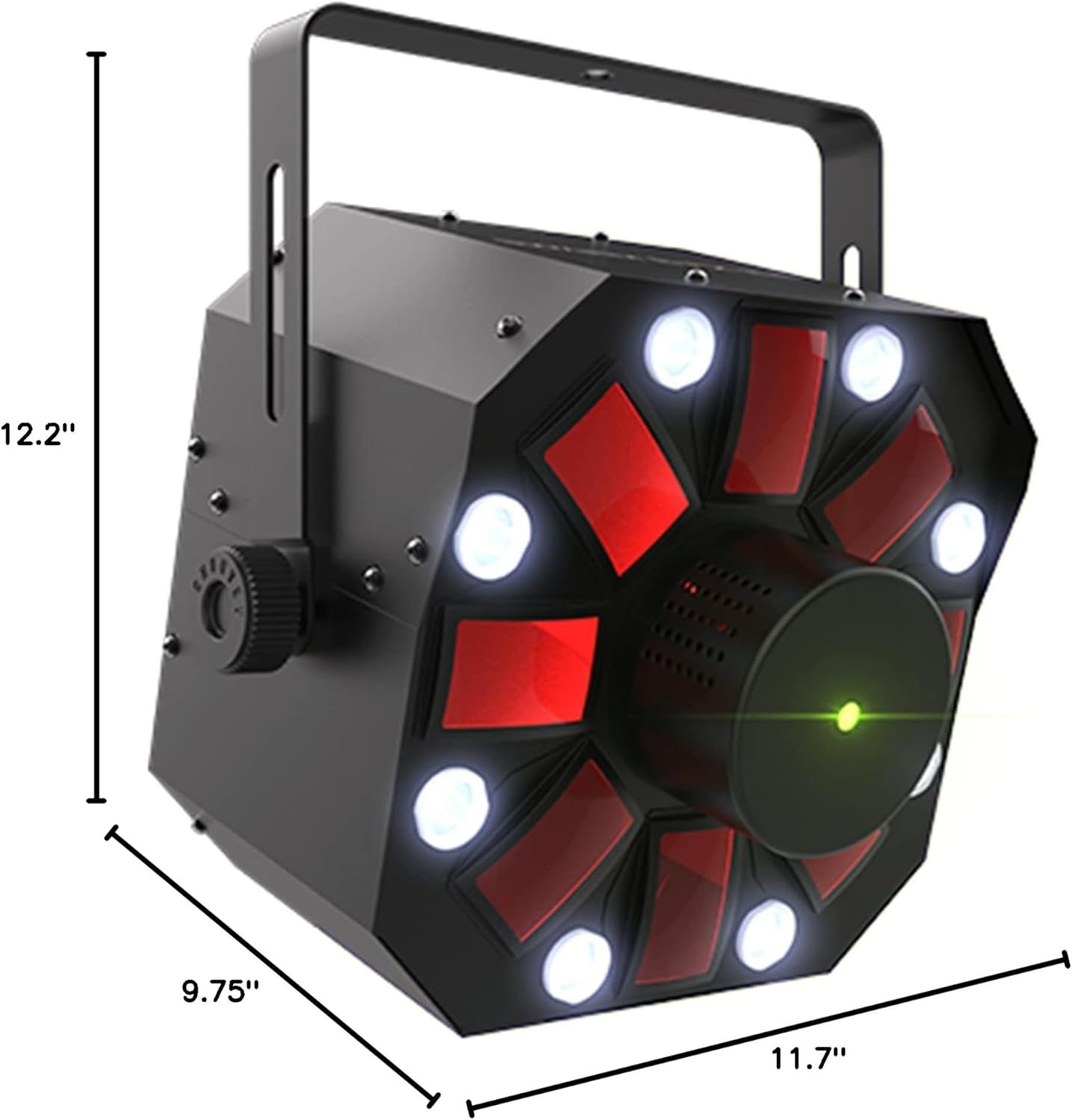 This 3-in-1 LED light features an RGBAW rotating derby, strobe effects, and ILS compatibility for coordinated light shows. With D-Fi USB for wireless control, it offers sound-activated programs, separate color control, and quick setup with power linking.