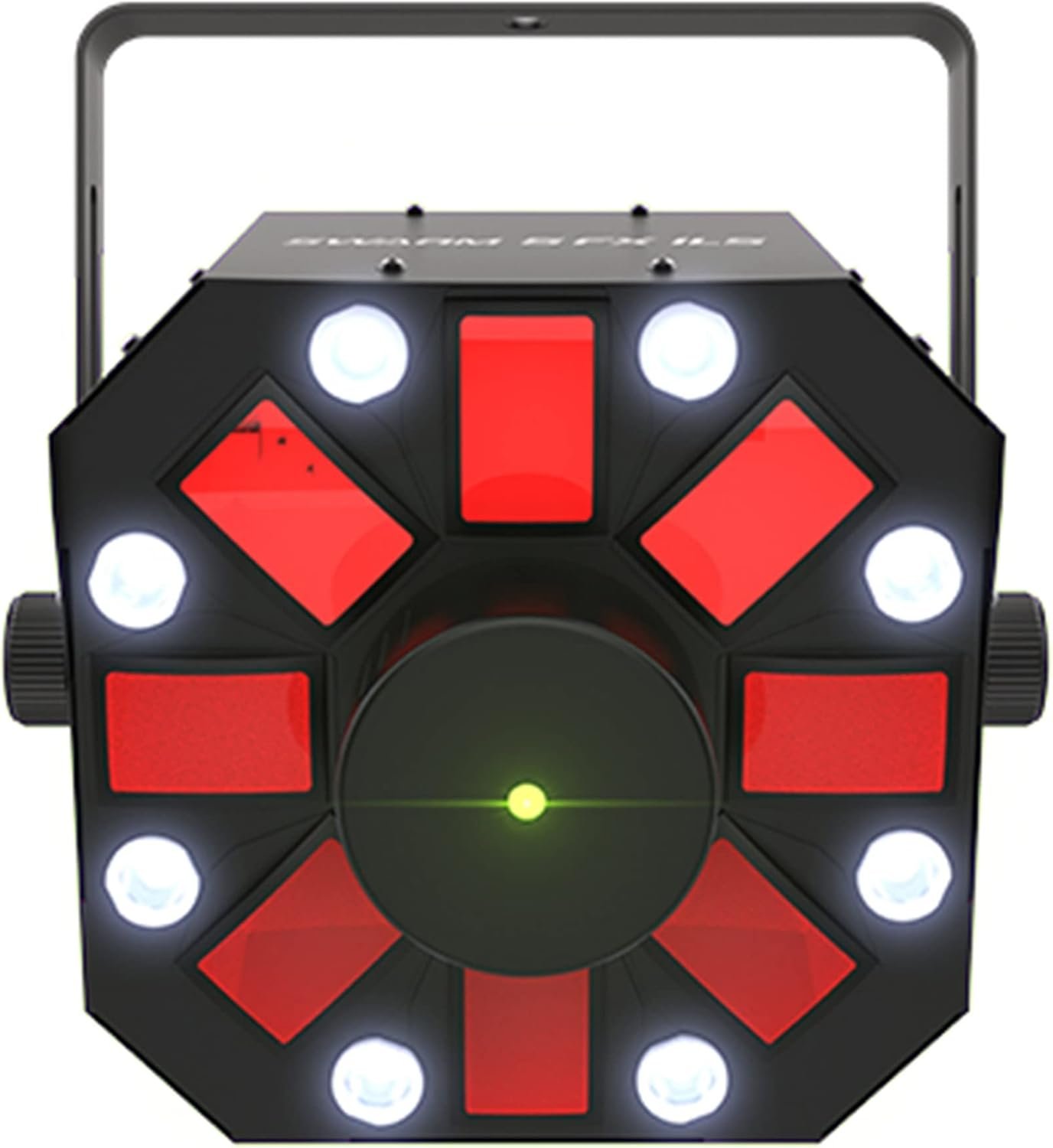 The Swarm 5 FX ILS is a versatile 3-in-1 LED light featuring an RGBAW rotating derby, strobe effects, and ILS compatibility for seamless light shows. It supports wireless Master/Slave or DMX control via D-Fi USB, and offers various operational modes including automated and sound-activated functions. Key specifications include a 100° coverage angle, 823 lux illuminance, and power linking for multiple units. It comes bundled with 2 DMX cables and an Austin Bazaar polishing cloth for maintenance. Weighing 9.8 lbs and measuring 9.75 x 11.7 x 12.2 in, it’s designed for easy setup and transport.