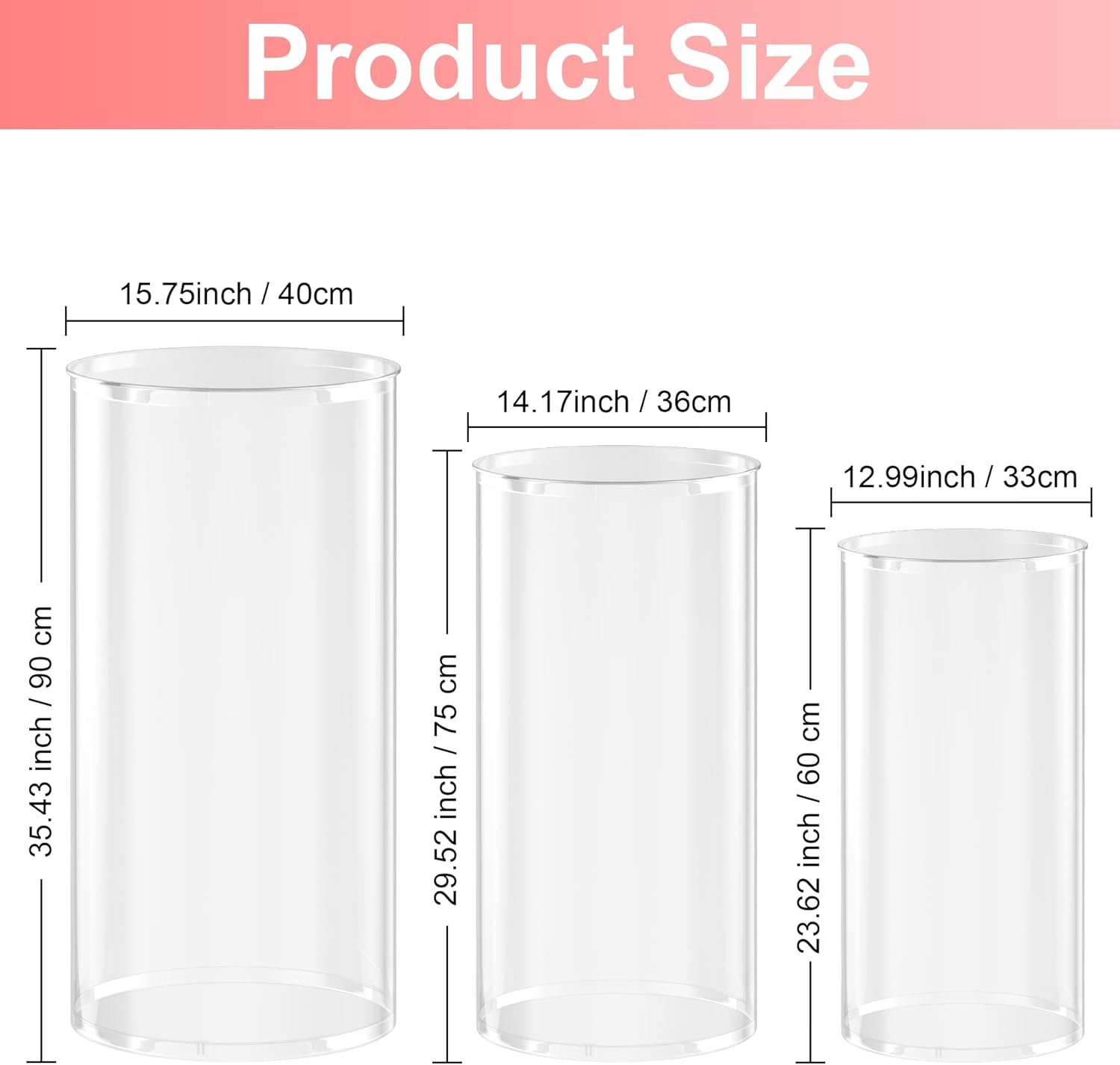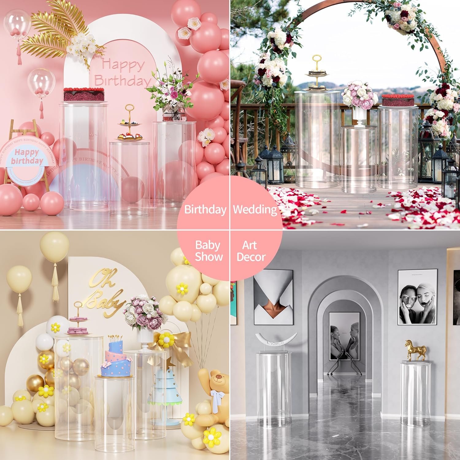 The crystal clear pedestal stand set is versatile for any theme, allowing decoration with items like lights, balloons, and flowers. It features a quick assembly process without tools and is lightweight for easy transport. Made of high-quality PVC and acrylic, the stands are waterproof and durable for long-term use, ideal for events such as weddings and parties. Their smooth base simplifies cleaning and storage. Each piece is securely packaged with protective film, and customer service is available for inquiries prior to returns.