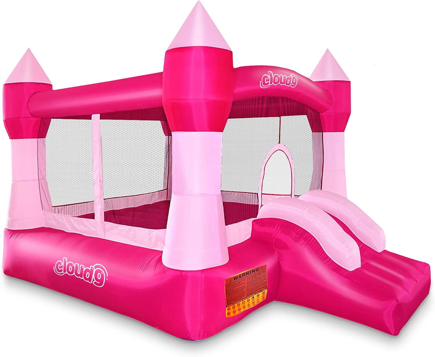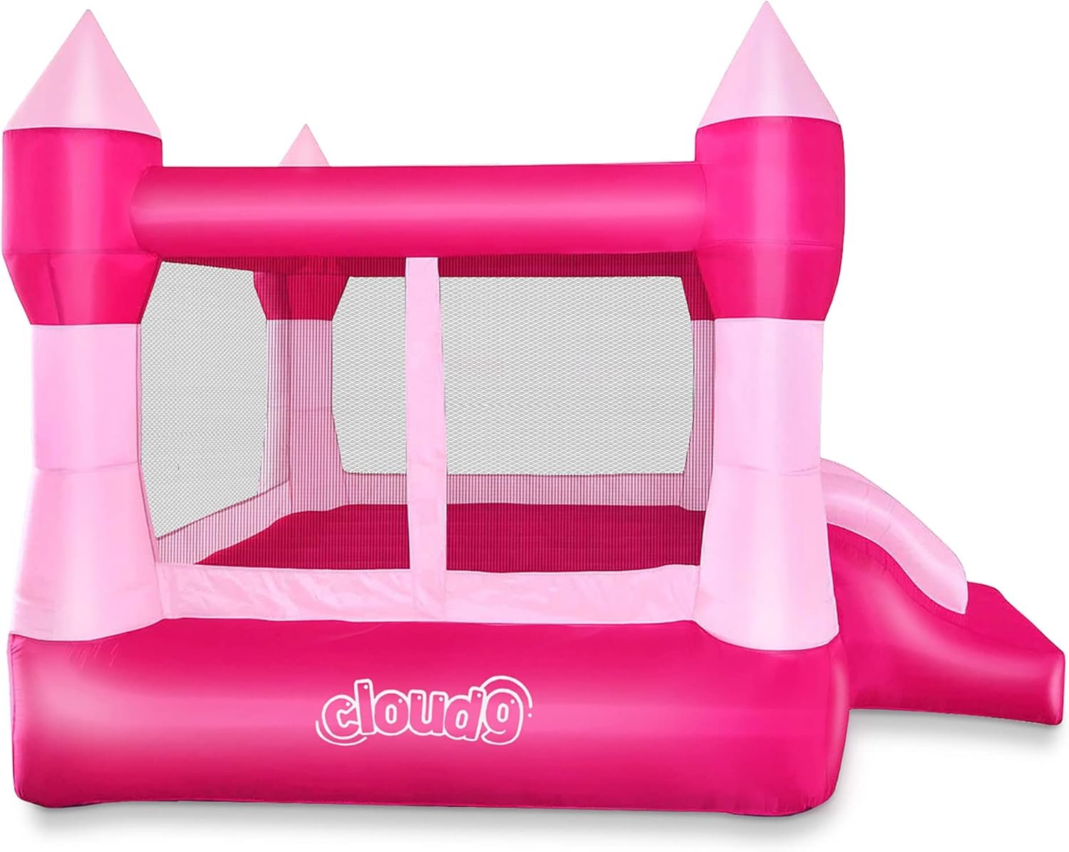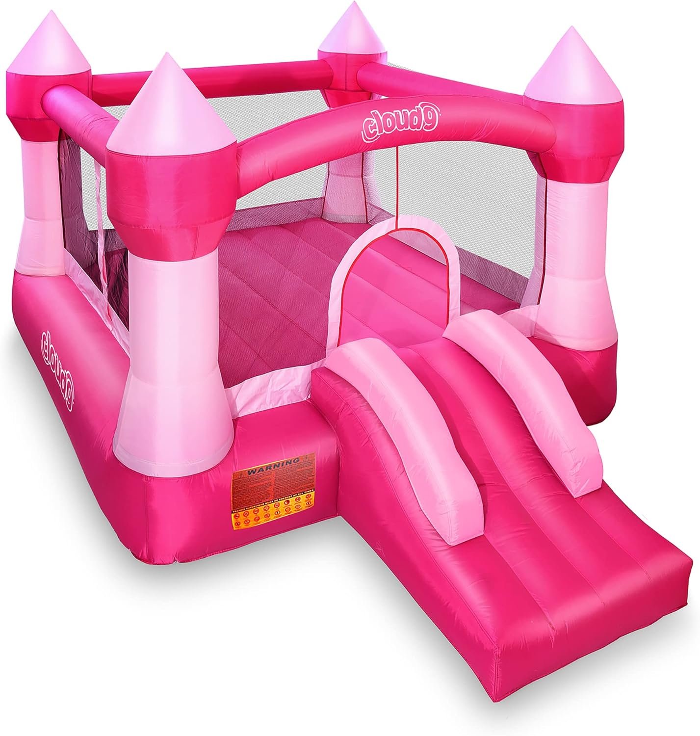 The Cloud 9 inflatable Princess Castle bounce house offers kids endless fun for parties and gatherings. Made from heavy-duty, fire-resistant 420D nylon, it complies with safety standards and is puncture-proof. Inflating in just a minute and quickly deflating for storage, it measures approximately 12′ x 9′ x 7′ and accommodates three children (up to 100 pounds each). The bouncer includes ground stakes for stable setup and comes with an instruction manual and repair kit, but a blower (not included) is required. It provides an affordable alternative to rentals for ongoing entertainment.