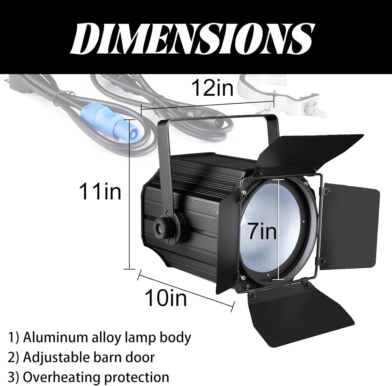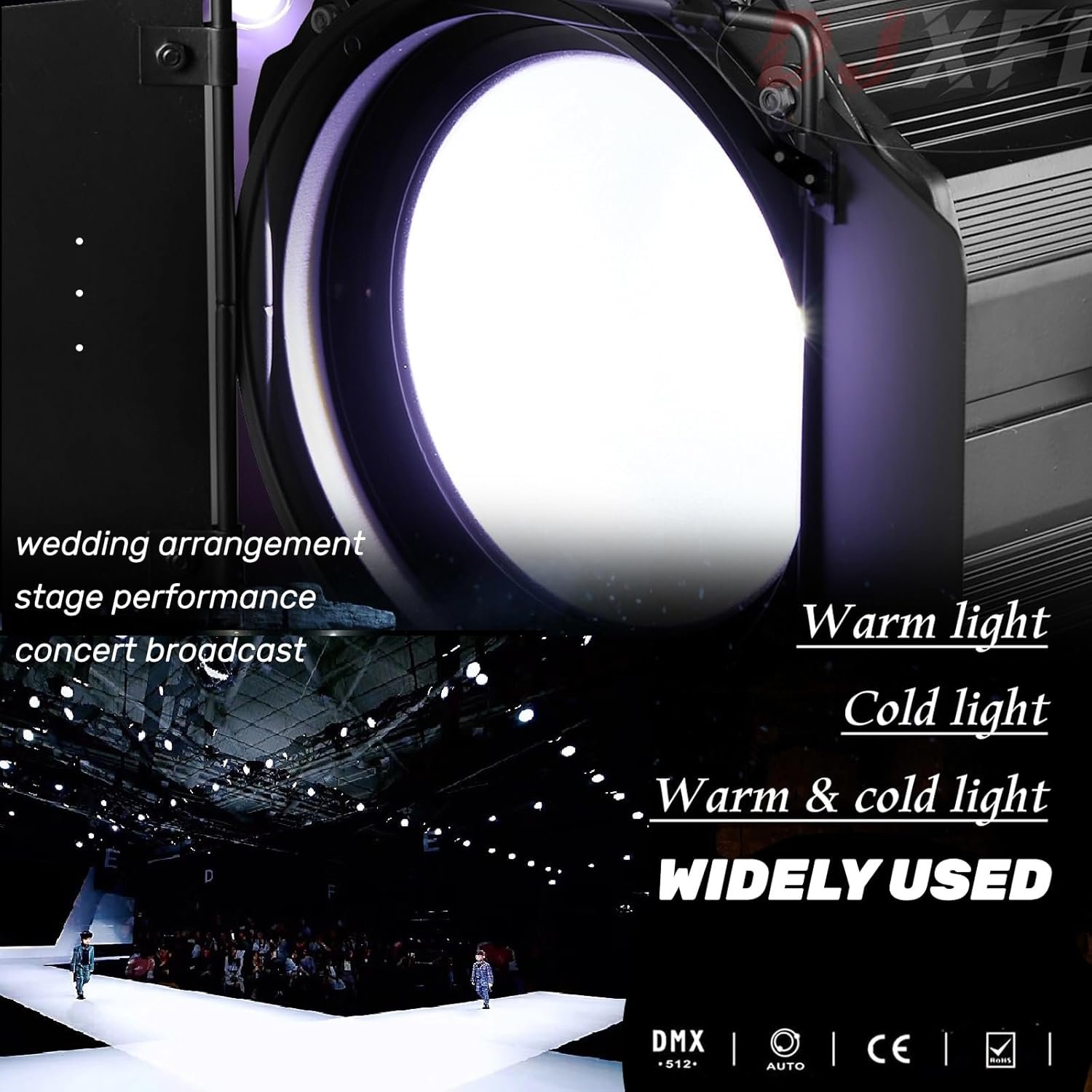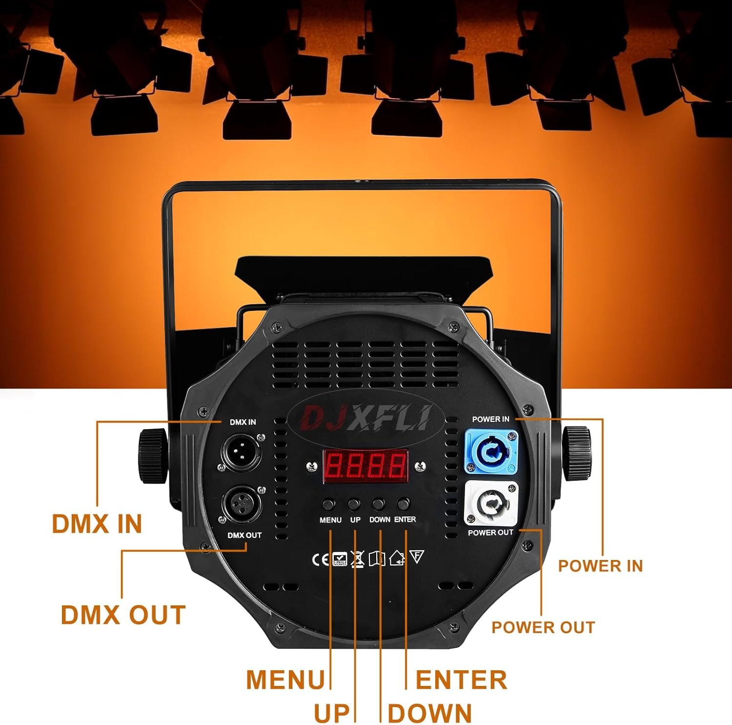 The DJXFLI Warm White + White 2in1 LED 200W COB Stage Light features adjustable barn doors for precise light control and a unique optical design for uniform coloring. It offers four control modes: DMX 512, automatic, sound activation, and master-slave. The light has a dimming range of 0-100% and operates at a voltage of AC90-245V. With a lifespan of up to 60,000 hours, this versatile stage light is suitable for various events, providing high brightness with adjustable angles. The package includes essential accessories for easy setup and installation.
