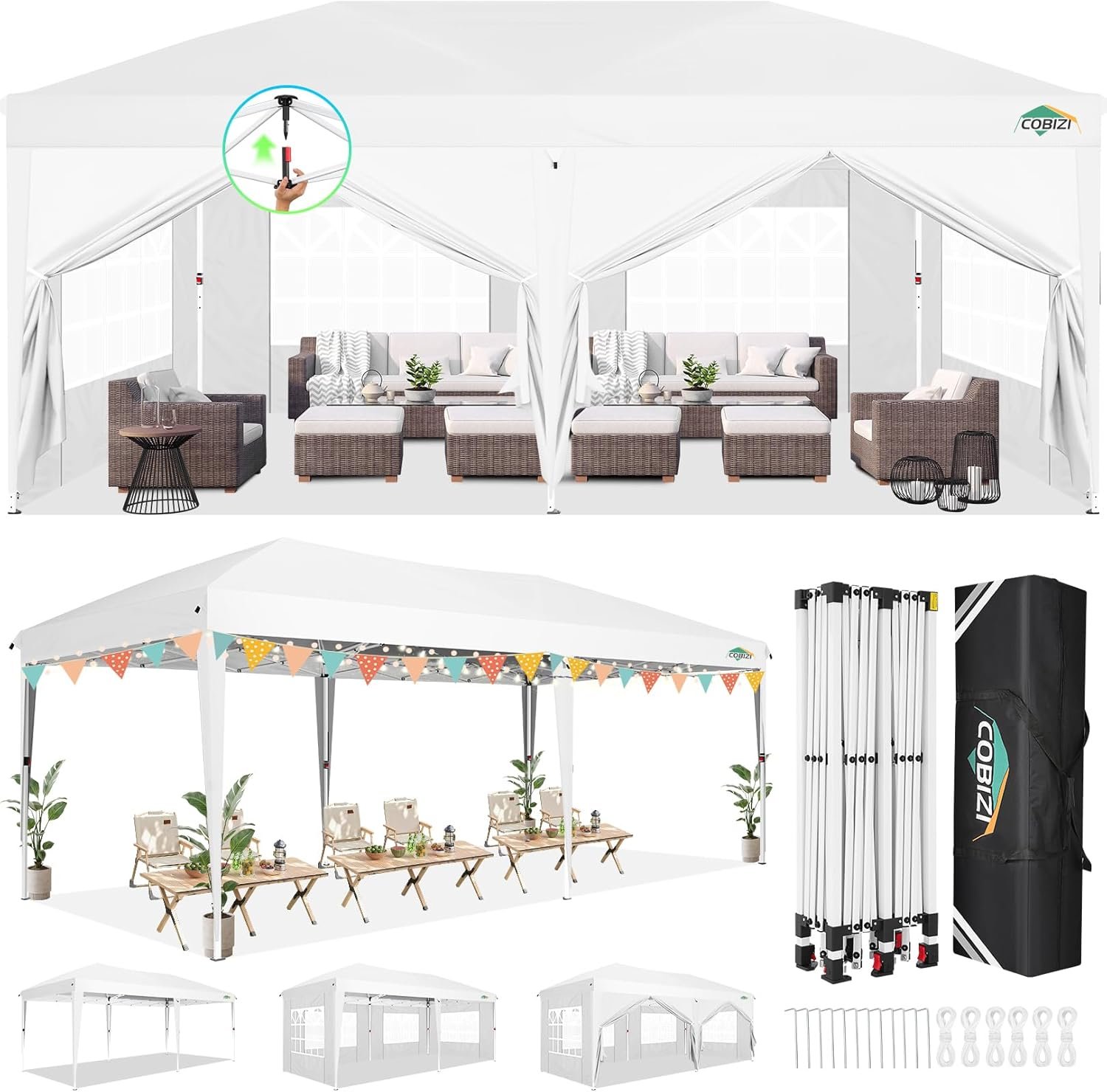 COBIZI offers high-quality outdoor canopies, specifically the 10×30 Pop Up Canopy Tent with 8 sidewalls, ideal for camping, market events, and parties. Featuring easy setup without tools, it includes 99.99% waterproof fabric and UV protection. The spacious tent accommodates 10-15 people, with adjustable heights and removable sidewalls for customization. Each package comes complete with a folding shelter, sidewalls, ropes, stakes, and a carry bag. COBIZI prioritizes customer satisfaction with a professional support team available to assist within 24 hours. Trust COBIZI for durable and versatile outdoor solutions.