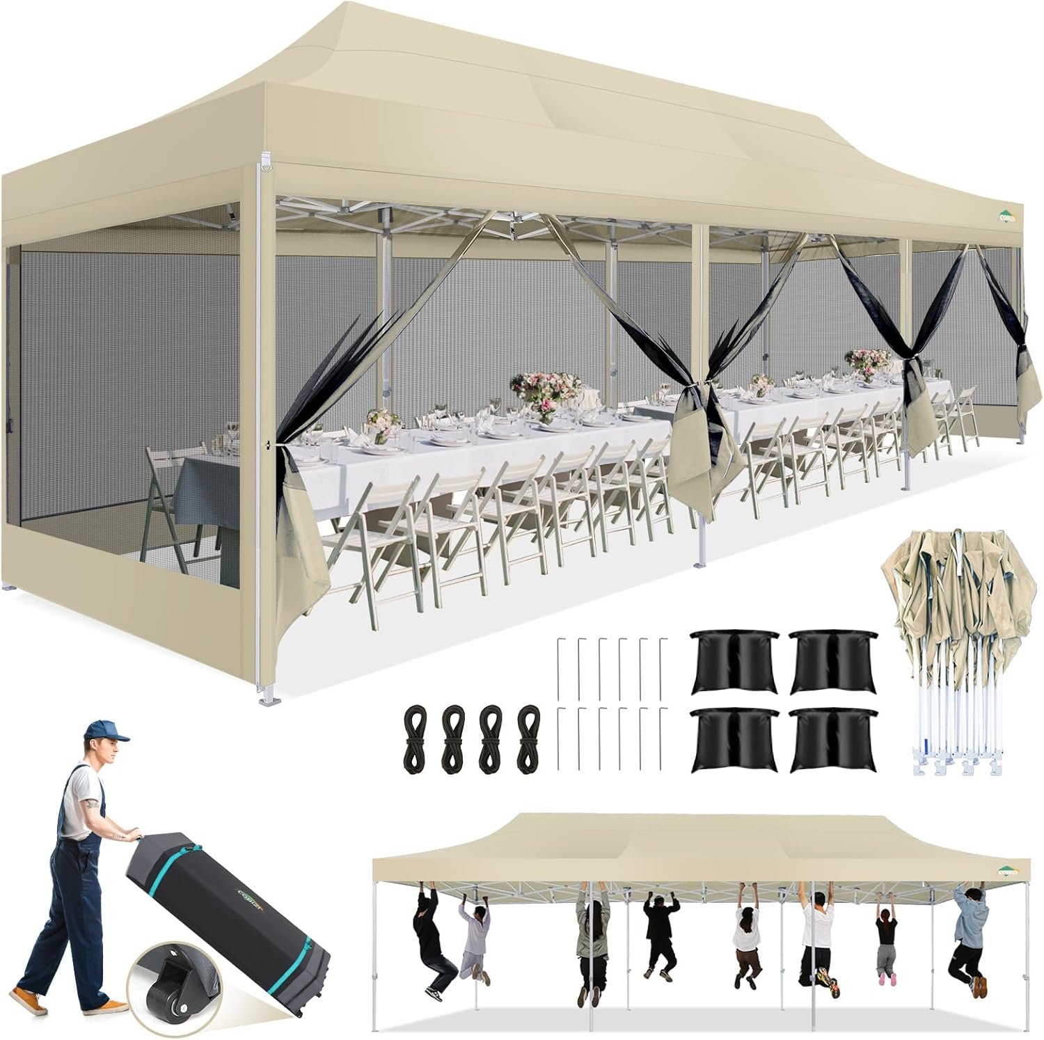 COBIZI 10×30 Canopy Tent, Heavy Duty Pop up Canopy with Sidewalls, Waterproof Easy Setup Canopy with Mosquito Netting, Outdoor Instant Screen Tents for Parties, Wedding with Roller Bag, Khaki