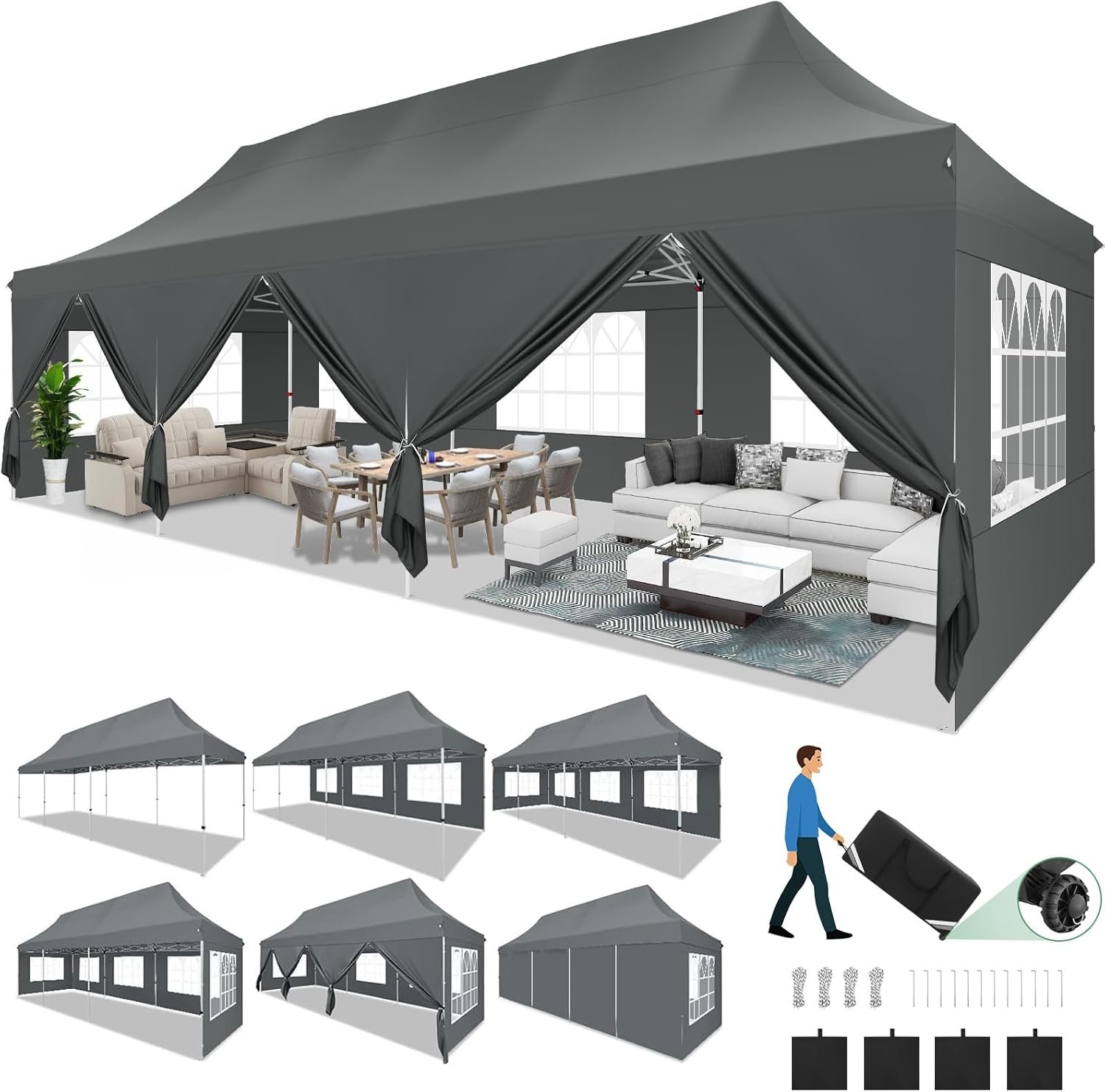 The 10×30 pop-up canopy tent is spacious enough for over 40 people, making it ideal for large gatherings like weddings and parties. Crafted from durable, waterproof 420D Oxford fabric with 99% UV protection, it features a strong steel frame to resist rust. The tent is easy to assemble and disassemble without tools, using a thumb lock system for safety. It includes 8 removable sidewalls (3 doors and 5 windows) that can be customized for different seasons. The package contains the tent frame, canopy top, sidewalls, sandbags, stakes, and a roller bag, with a 1-year satisfaction guarantee.