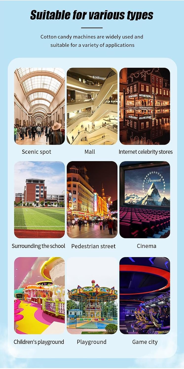 The Automatic Cotton Candy Vending Machine offers a modern, self-service solution for high-margin snacks, perfect for various venues like malls and cinemas. Featuring a robotic candy floss maker, touchscreen interface, and real-time inventory control, it provides customizable flavors and hands-free operation. Built for heavy use, it includes a high-capacity sugar hopper, cashless payment integration, and auto-cleaning features. Ideal for vending startups, this machine ensures smooth operation with adjustable heat settings and a user-friendly design, backed by 30 years of manufacturing experience and a one-year warranty for support.