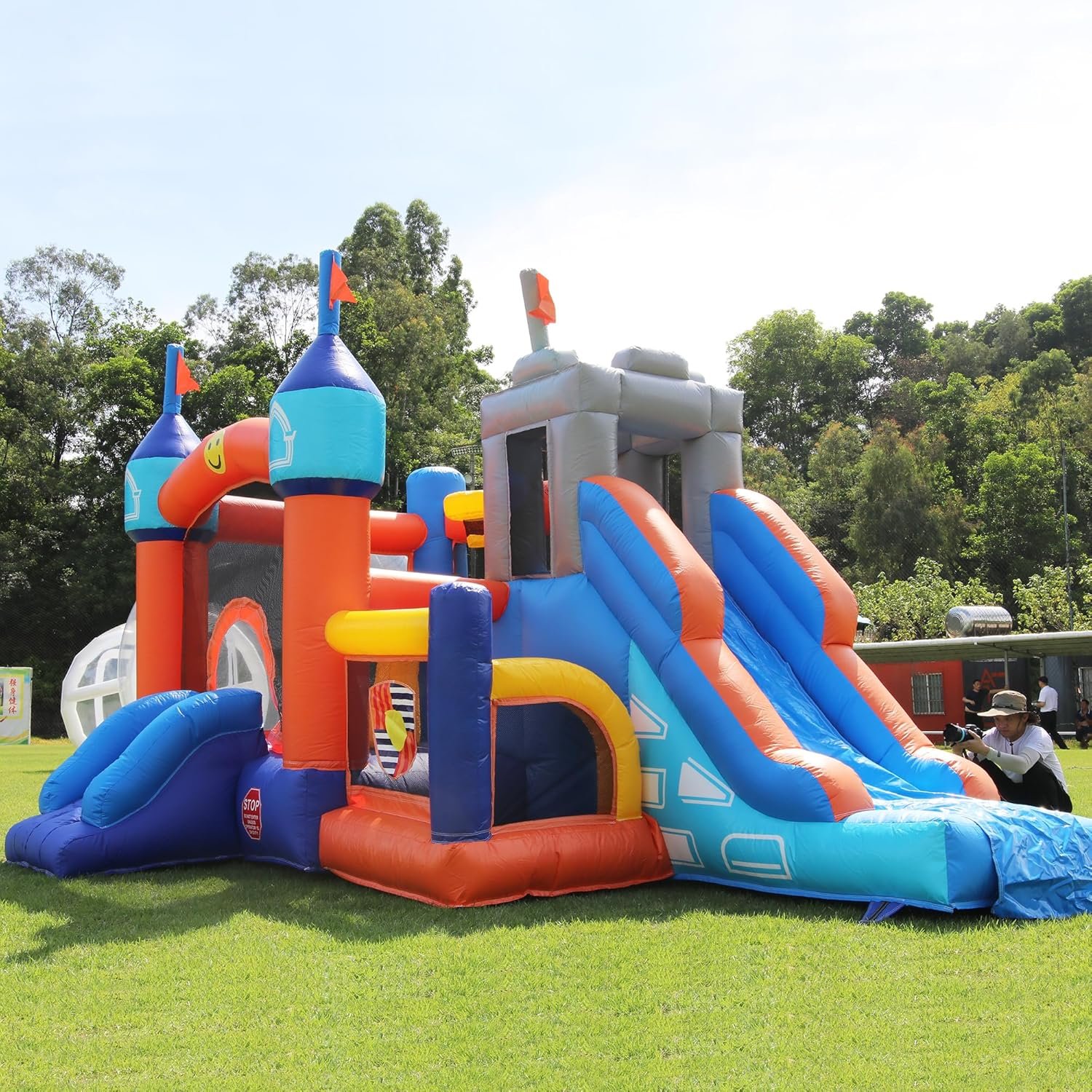 🌈 Inflatable Bounce House: 16L x 12W x 10H FT, perfect for 5-8 kids aged 3-12! This 6-in-1 obstacle course ensures endless fun with tunnels, obstacles, and a slide. Made from heavy-duty PVC for durability and easy cleaning. Safety net provides a secure play area! Easy setup with a 950W blower.