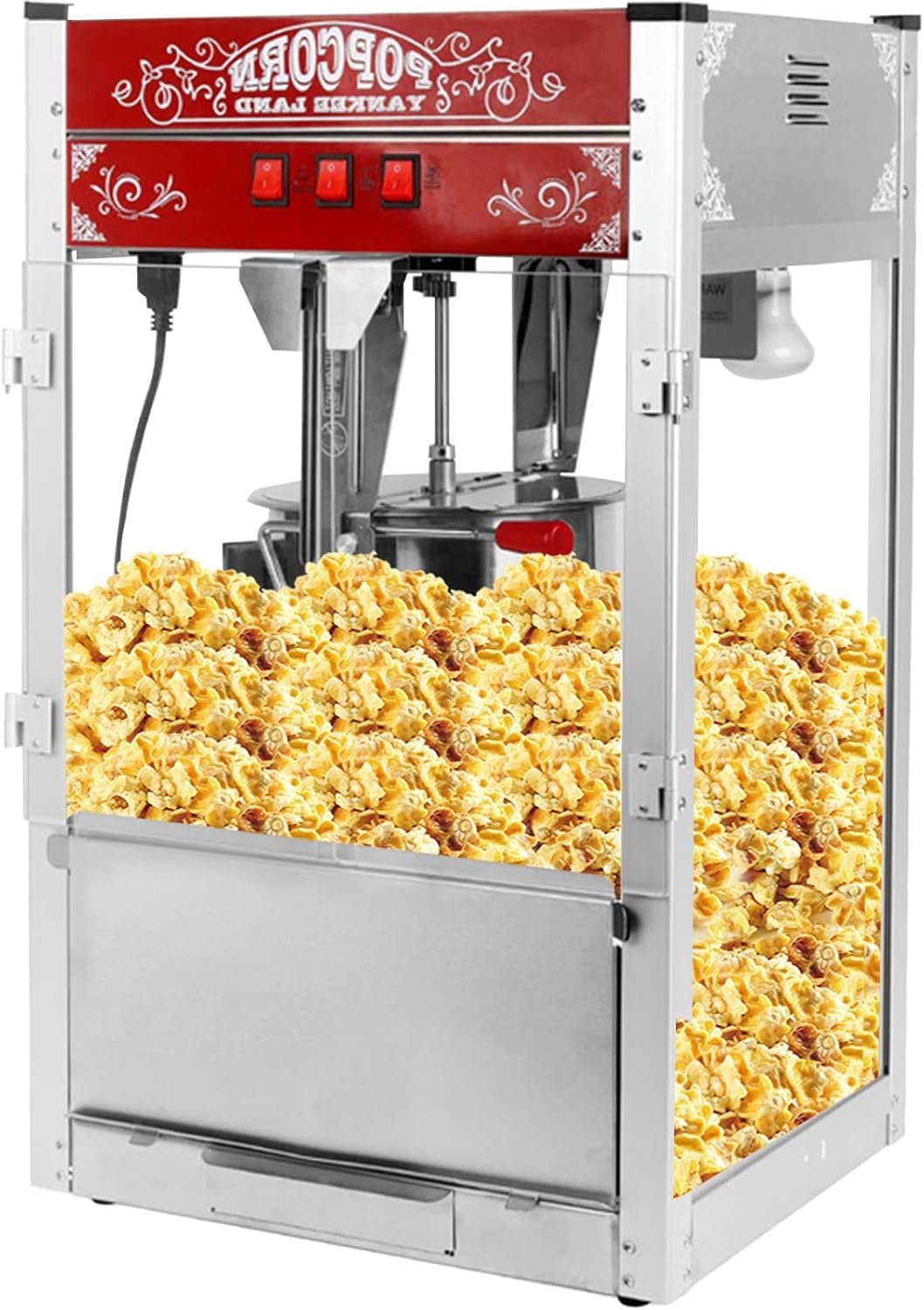 This commercial popcorn machine features a 1440W power supply and a 16 oz kettle, popping up to 80 cups of popcorn per batch. It has simplified operation with easy-to-use switches for the warmer, stirrer, and pot heater. The durable design includes a cold-rolled steel frame and tempered glass, with magnetic latches for quick access. A 100W warming deck keeps popcorn hot while a 60W light enhances visibility. Accessories include a popcorn scoop and measuring spoons, all made of food-grade stainless steel, ensuring hassle-free operation and maintenance for busy concession stands or events.