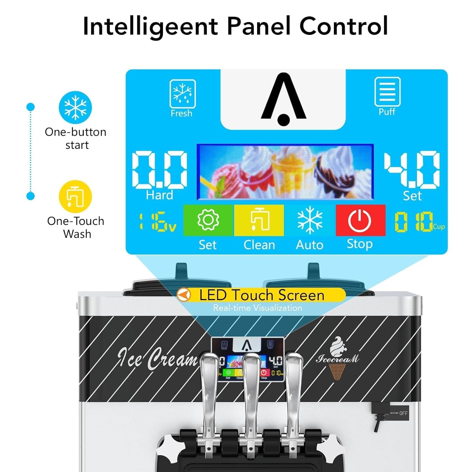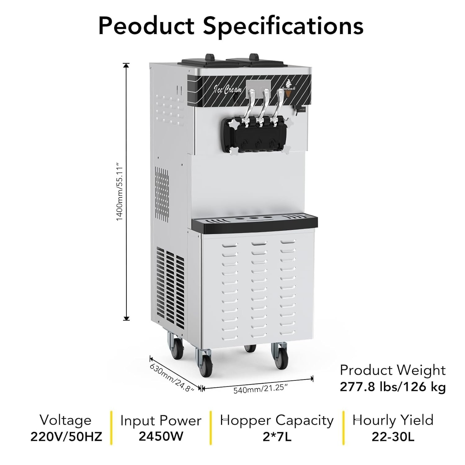 The Vossfamul soft serve ice cream machine features a 14L capacity and offers three flavor options: two single and one mixed. It includes a smart LED panel for easy control of ice cream quantity, hardness, and temperature. The pre-chilling and puffing functions ensure a smooth, creamy texture. A one-button cleaning feature simplifies maintenance, with an ergonomic handle for dispensing. Designed for both commercial and home use, it is ideal for dessert shops, cafes, and restaurants. The machine is portable, with a removable drip tray and heat dissipation mesh to prevent overheating.