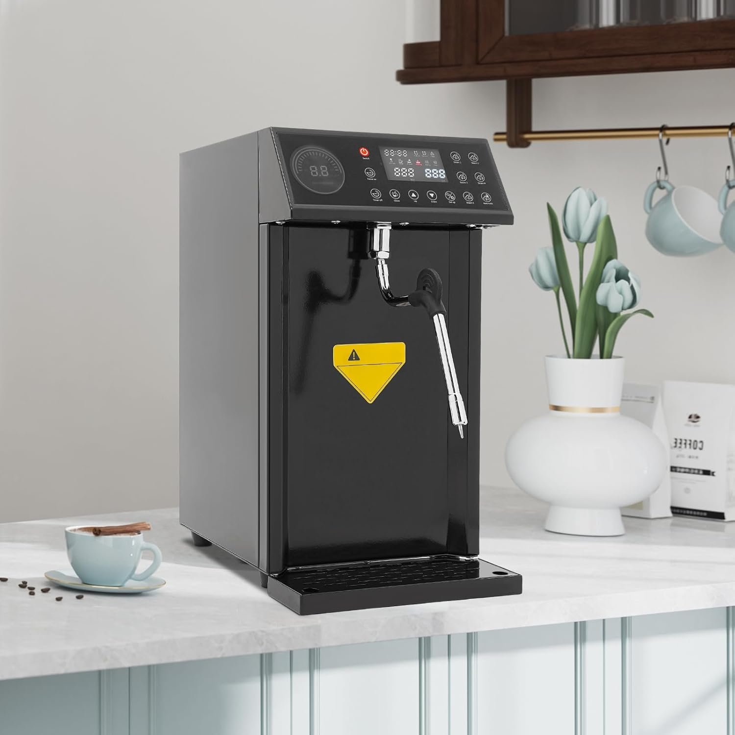 KUMOYOU offers a diverse range of products, including tools, home decor, garden essentials, and automotive supplies, focusing on reliability and affordability. Their steam milk foam machine features a sturdy design with 2.11-gallon capacity, heating 13.53 oz to 122°F in just 20 seconds. It includes customizable temperature settings, a 24-hour timing function, safety protections, and a thoughtful design for easy cleaning. Compact and efficient, the machine is user-friendly with an LED display and occupies minimal countertop space, making it ideal for various settings.