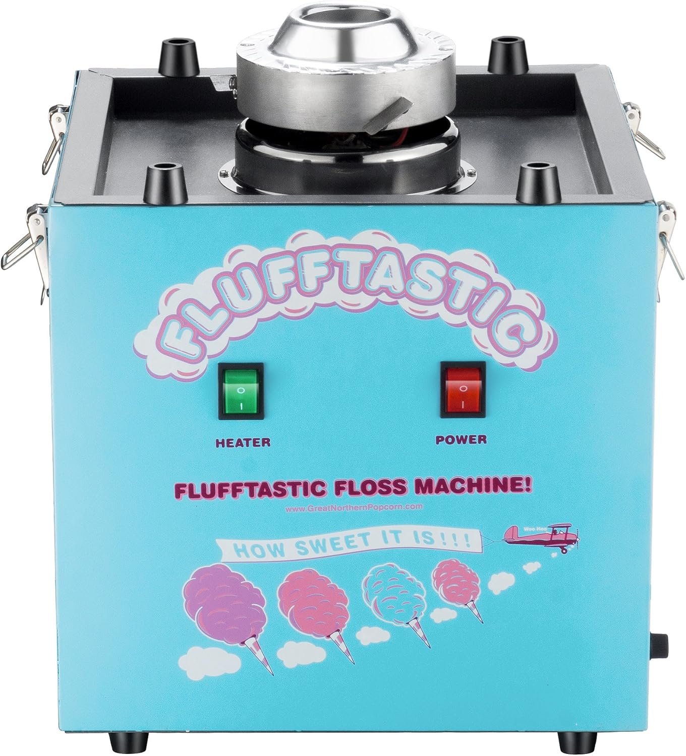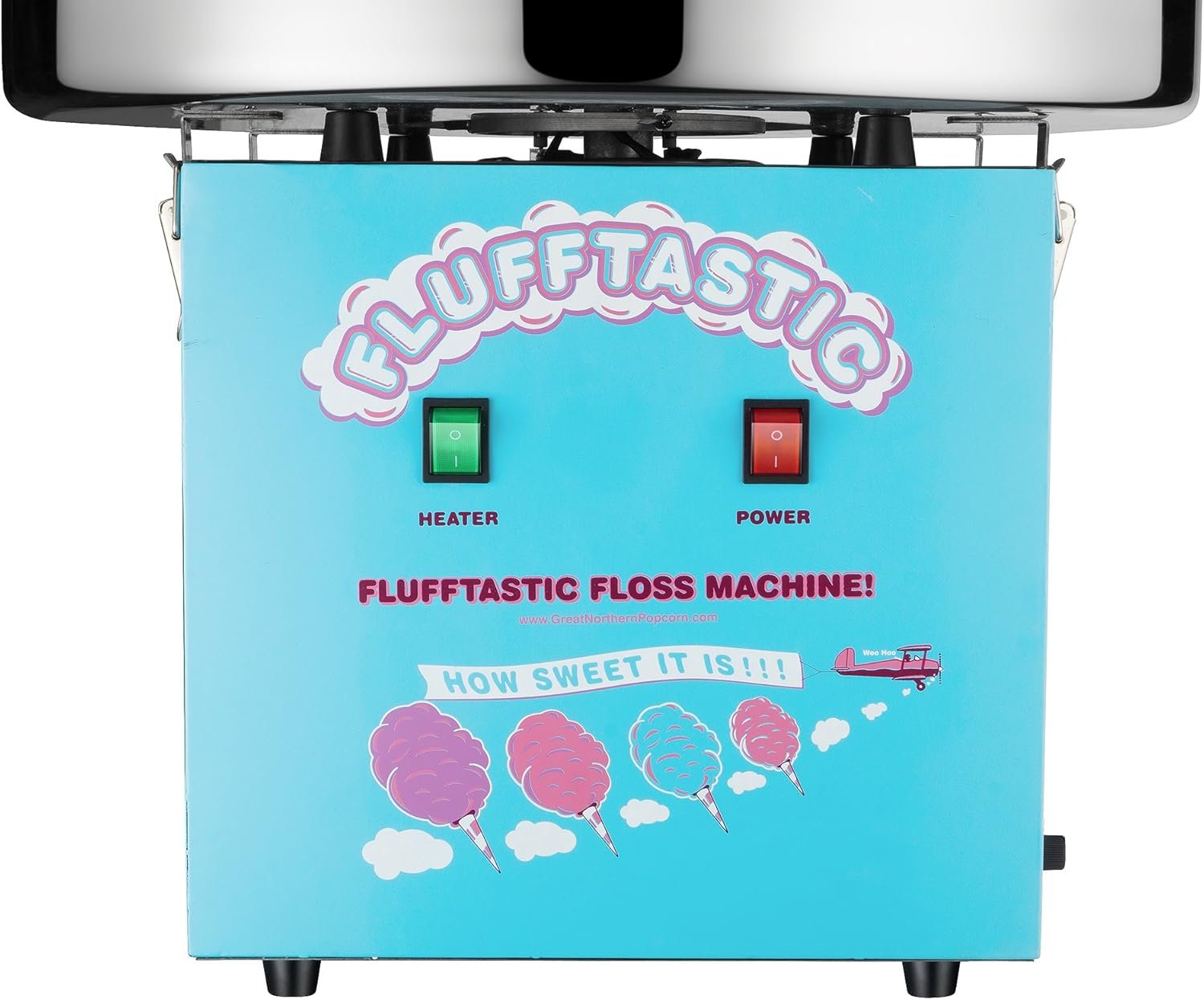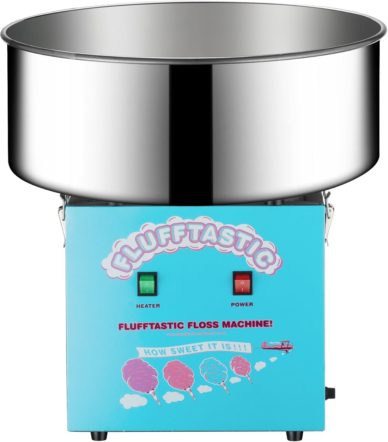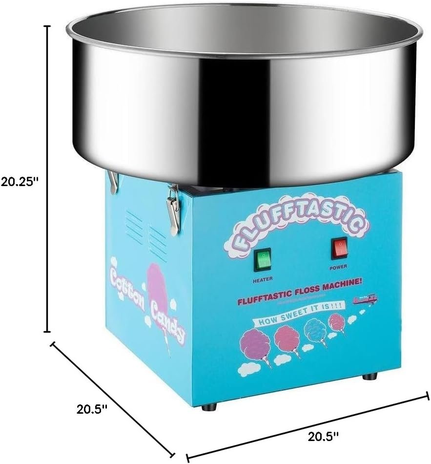 The Flufftastic Sugar Floss or Hard Candy Cotton Candy Machine by Great Northern Popcorn is perfect for parties and events, producing a cotton candy cone every 30 seconds with its 1000-Watt heating element and direct drive motor. It features a 20.5-inch stainless steel bowl, compatible with optional Great Northern Popcorn Bubble. Easy to use, it requires just a 4-minute warm-up and comes with a sugar scoop. This high-quality, whisper-quiet machine brings a festive carnival atmosphere home, ensuring it stands out at any gathering. Great Northern Popcorn guarantees authenticity and quality for their products.