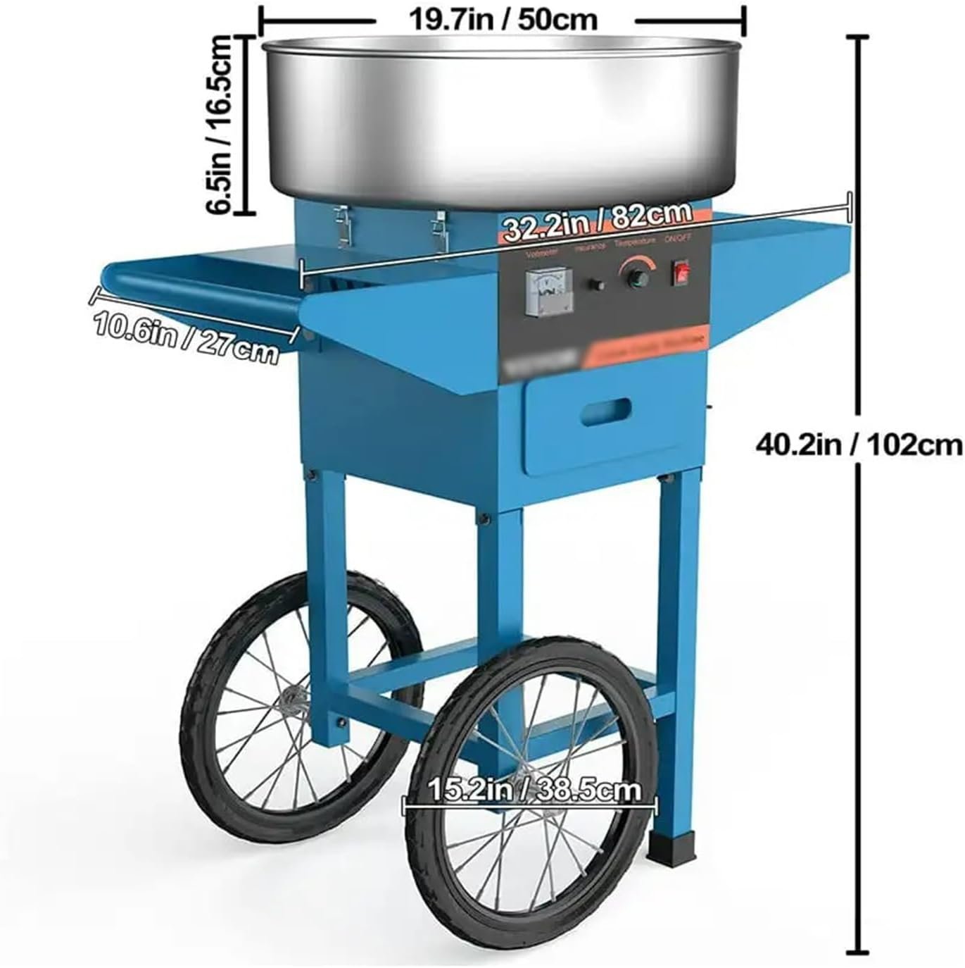 The cotton candy maker features a stainless steel bowl, aluminum, and carbon steel construction, with a 19.7-inch bowl size. It has 1000 watts of heating power and a 35W motor, producing colorful cotton candy in about 5-6 minutes. The unit measures 40.2 x 32.2 x 19.7 inches, weighs 20 kg, and includes 15.2-inch wheels for mobility. Suitable for various sugars, it’s ideal for festivals, parties, and family gatherings. The machine has a detachable design for easy maintenance, and customer support is available for any inquiries.