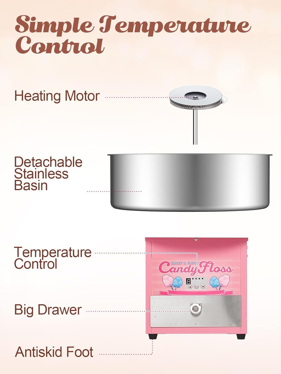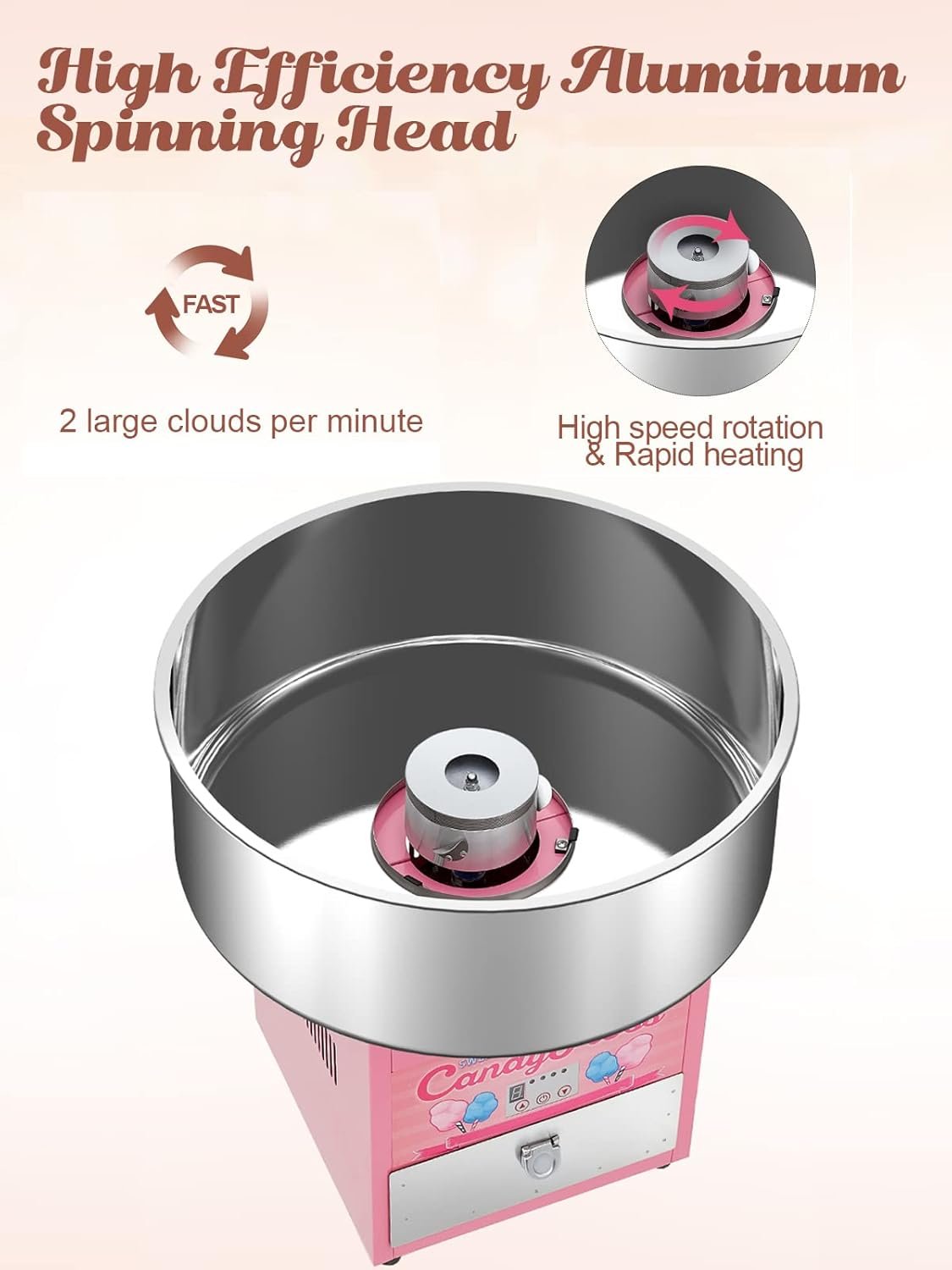 This cotton candy machine features a powerful 1200W heating element and a 20.5″ stainless steel bowl designed for easy cleaning. It can produce 2-3 servings of cotton candy per minute and includes temperature control for optimal performance. The locking clips minimize vibration during use, making it user-friendly. Priced around $138.81 to $229.85, it is ideal for family parties, carnivals, sporting events, and street stalls. Customer reviews are mixed, with ratings ranging from 2.0 to 3.4 out of 5 stars.