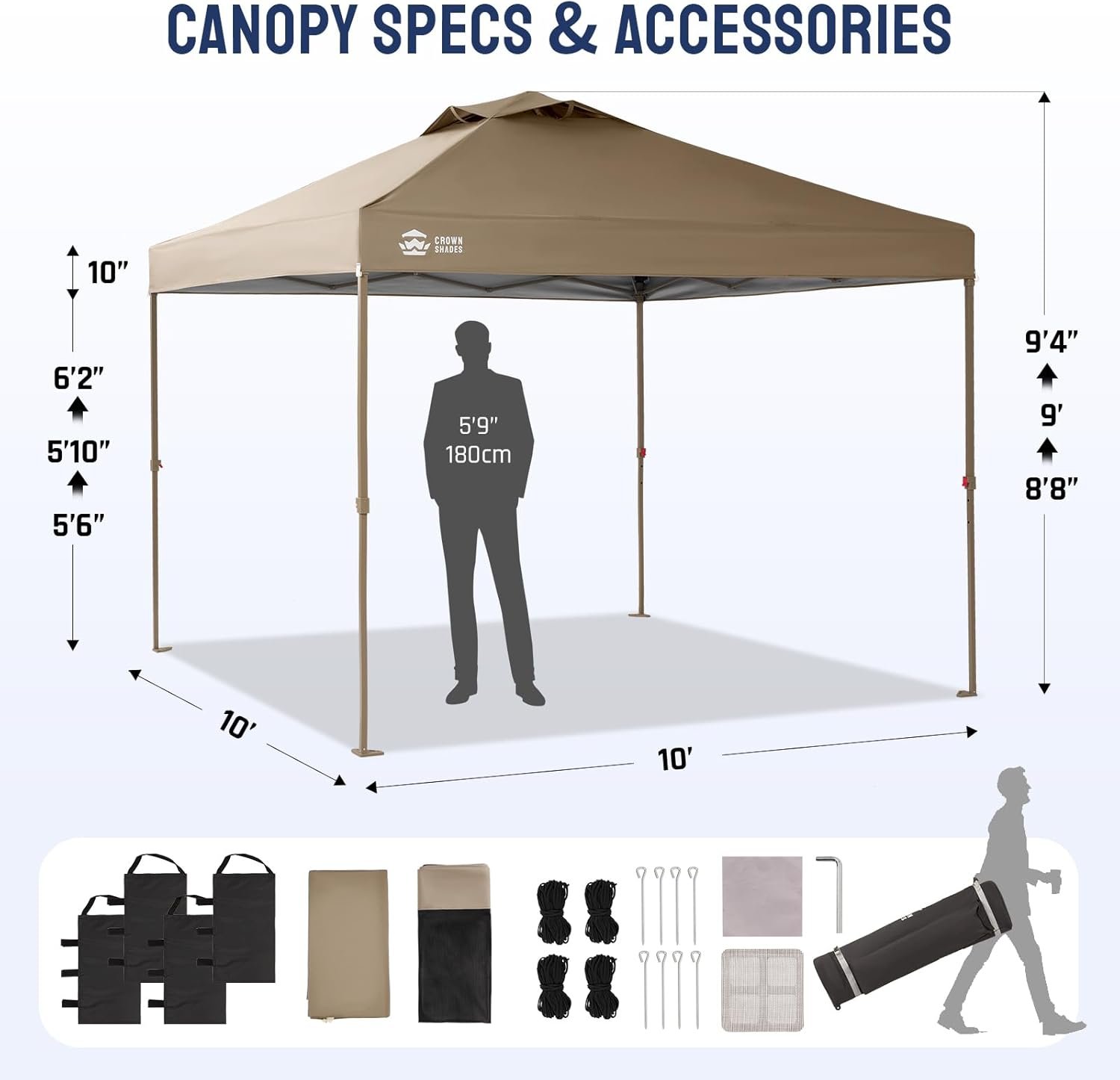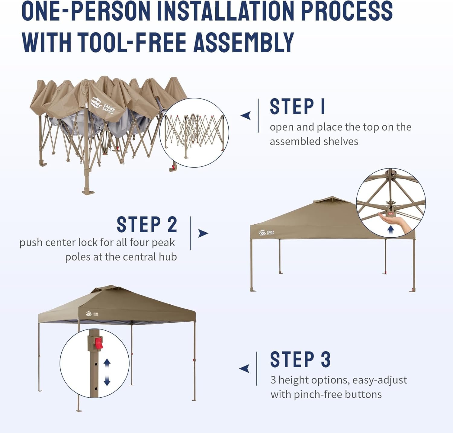 Crown Shades offers innovative, easy-to-use canopies featuring patented Central Lock Technology for quick setup by one person in seconds. Their products include various canopy and gazebo styles, ensuring minimal hassle with adjustable heights and portable designs. Built with heavy-duty materials, the canopies provide superior UV protection, weather resistance, and smart ventilation. Enhanced safety features, like pin-free buttons and bug defenses, make them ideal for events, markets, and outdoor gatherings. A complete stability kit is included for secure setup, emphasizing their commitment to quality, innovation, and customer support.
