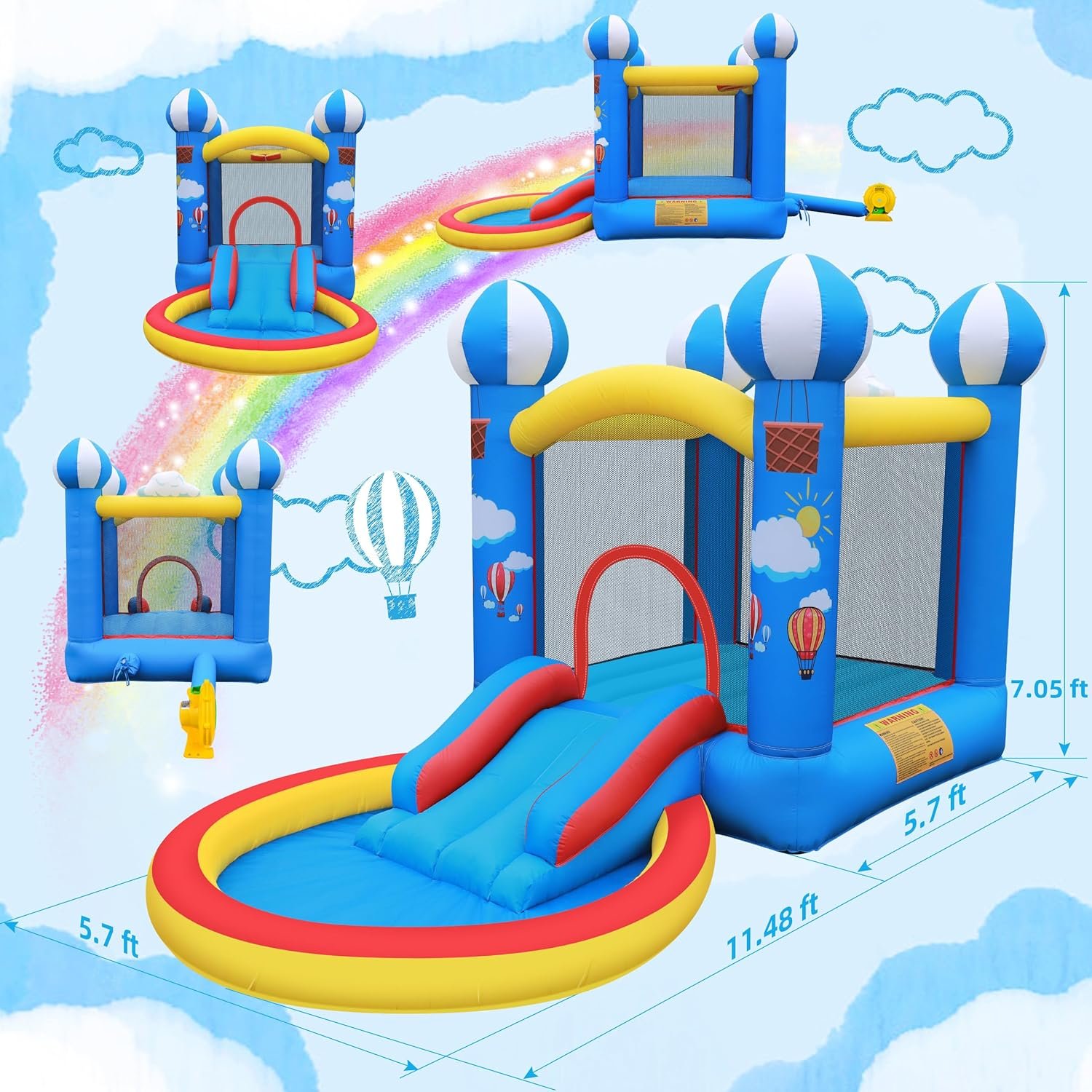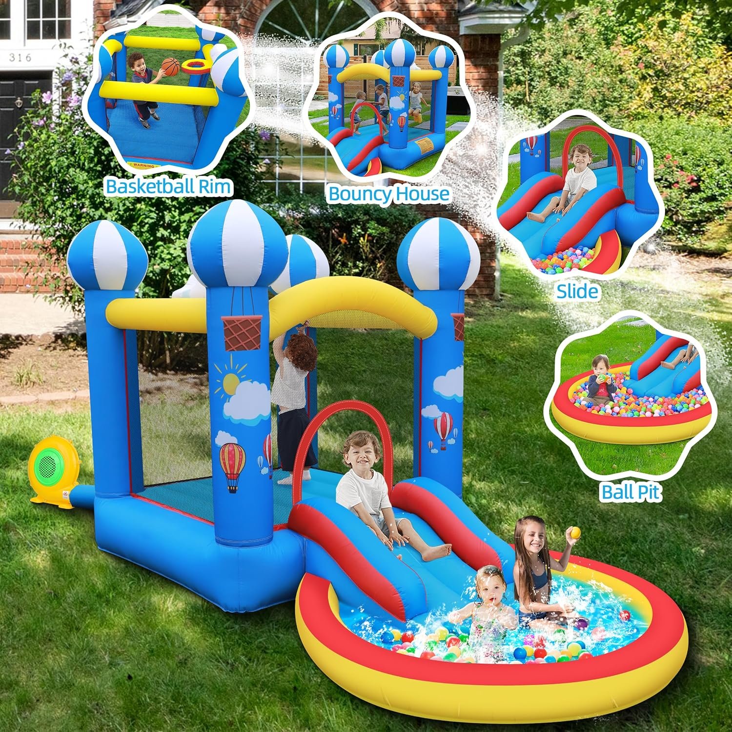 Transform your backyard into a water park with our inflatable bounce house! Featuring a 4-in-1 design, it includes a ball pit, slide, and basketball rim to keep kids entertained ages 3-6. Made from durable Oxford fabric, it’s built to last and withstand active play. Enjoy refreshing fun by adding water to the ball pit on hot days. Easy to set up with a 370W blower, this bounce house is perfect for indoor and outdoor use, making playtime a breeze anywhere you go, with convenient storage when not in use.