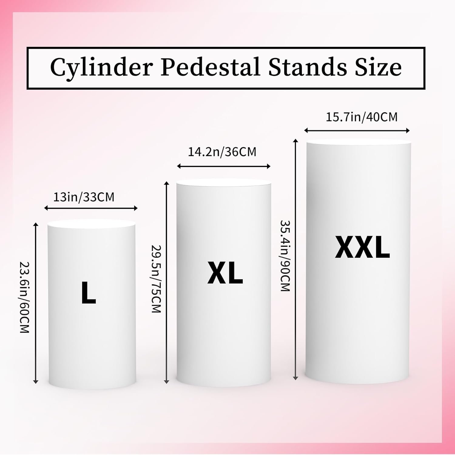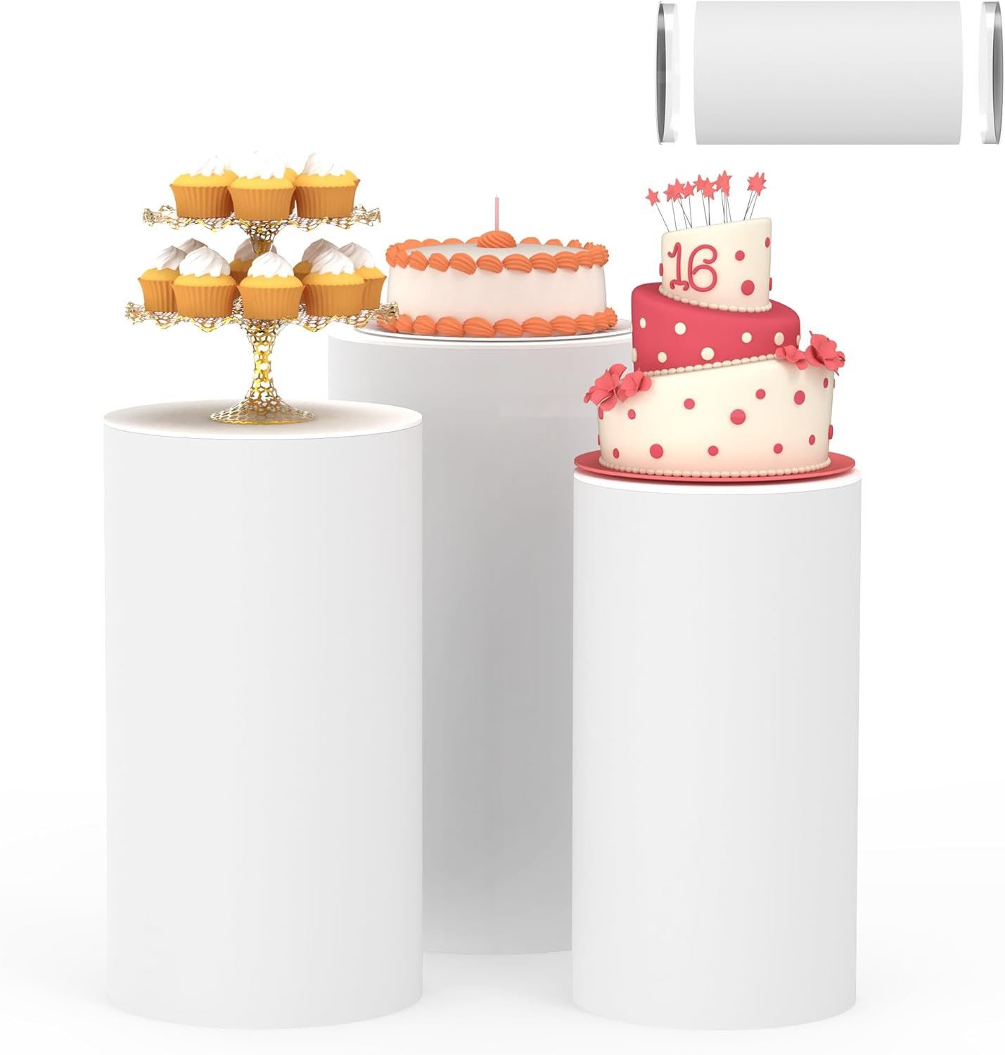 The Cylinder Pedestal Stands set includes three sizes: 13″ wide x 23.6″ high, 14.2″ wide x 29.5″ high, and 15.7″ wide x 35.4″ high, designed for versatile party decoration. Made of lightweight yet stable materials, these reusable stands are ideal for showcasing cakes, desserts, flowers, or artworks at various events like weddings, birthdays, and graduations. The modern white design fits any theme, and the set is easy to install with included tools. Stands can also be stacked for space-saving storage, making them practical for any occasion.