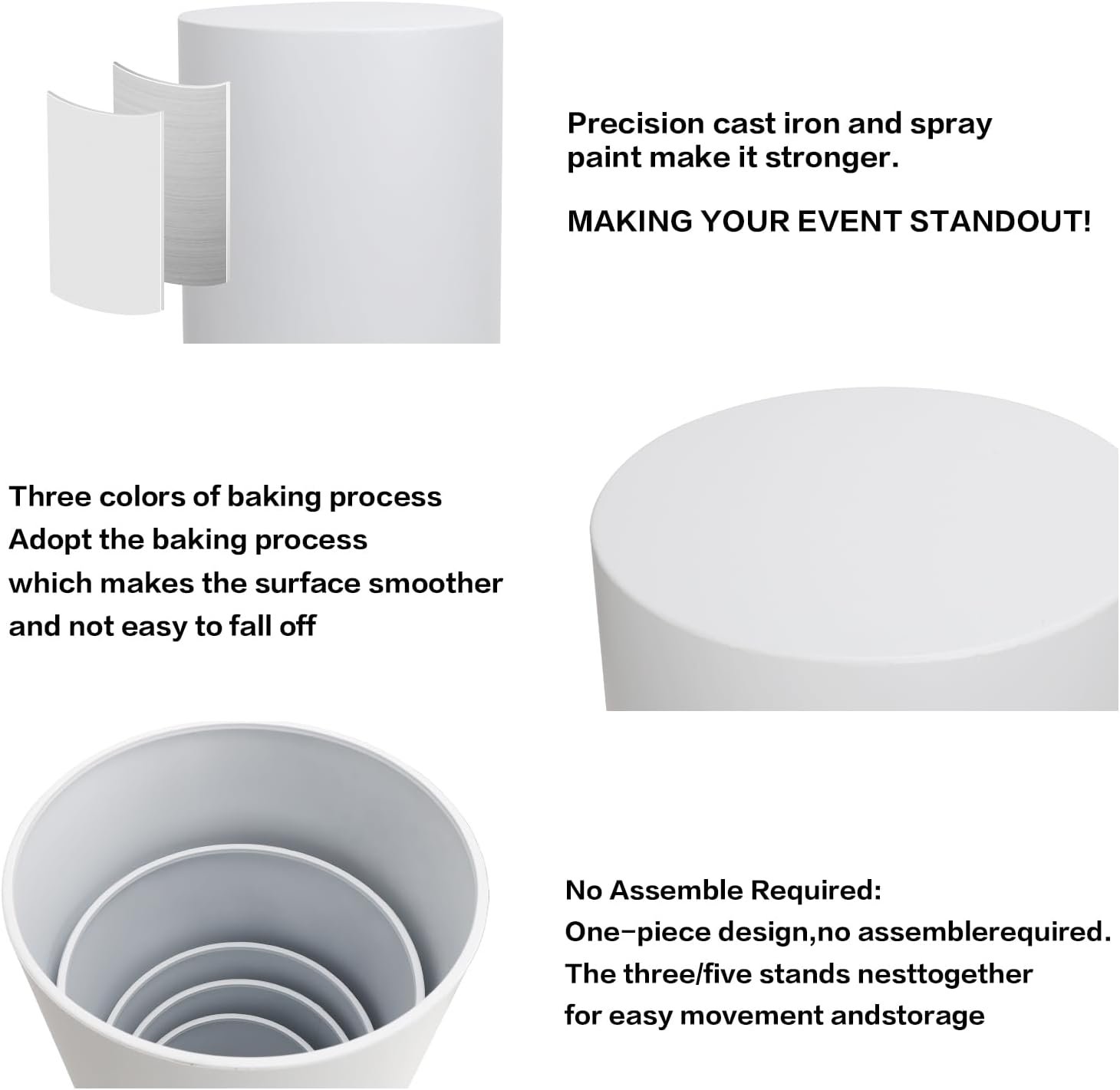 The cylinder stands feature a durable painted steel frame that is lightweight and resistant to damage. No installation is required, making them easy to use and store when not in use. These versatile pedestals serve as dessert tables, display stands for plants, and can even be inverted for storage. Available in vibrant blue and pink options, they come in a range of sizes to suit various needs. They are designed for stability and portability, and their compact design allows for easy stacking, making them ideal for parties, weddings, and other events.