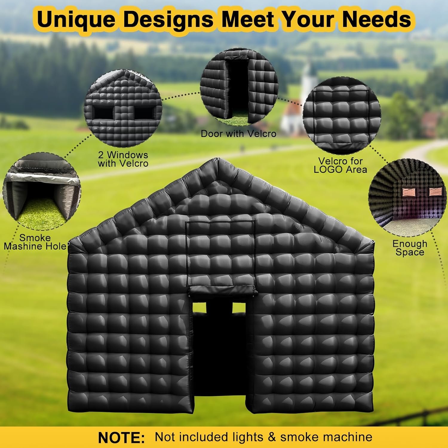 The inflatable nightclub tent is made from premium oxford cloth, featuring double and quadruple stitching for durability. It includes multiple zipper outlets for easy setup, a detachable door curtain, and a D-ring for disco lights. Designed for various events like weddings and birthdays, it allows for custom branding with Velcro space. The package includes an air blower, ropes, stakes, and sandbags for stability. Care instructions ensure longevity and optimal performance. This tent aims to create memorable experiences while prioritizing user satisfaction.