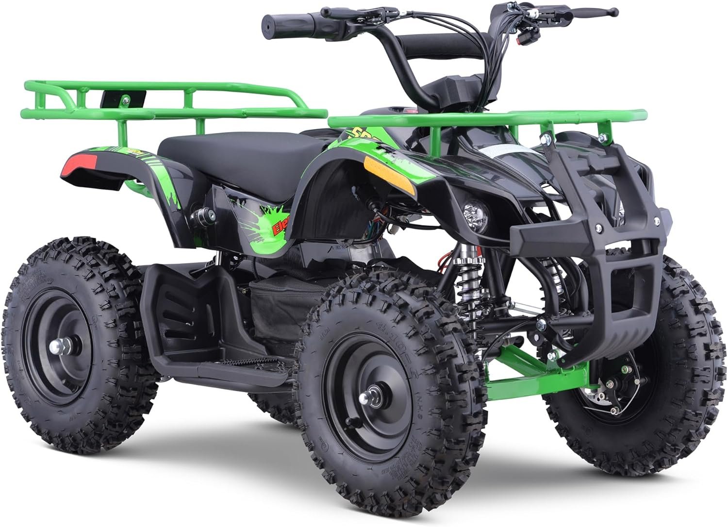 This off-road dirt quad features a powerful 500W motor and a 36V 12AH lead-acid battery, accommodating a maximum weight of 65 kg. It achieves speeds of up to 15 mph, with low-speed options at 10 mph. The quad includes a chain drive system, disc brakes, and 4.10-6 pneumatic tires, ensuring stability and traction. Design features include a distinctive look, twist-grip throttle, LED headlight, suspension, and soft rubber grips, all within an extra-large frame. It measures 41″ L x 26″ W x 23″ H and takes 6-8 hours to charge, making it ideal for older riders seeking adventure.