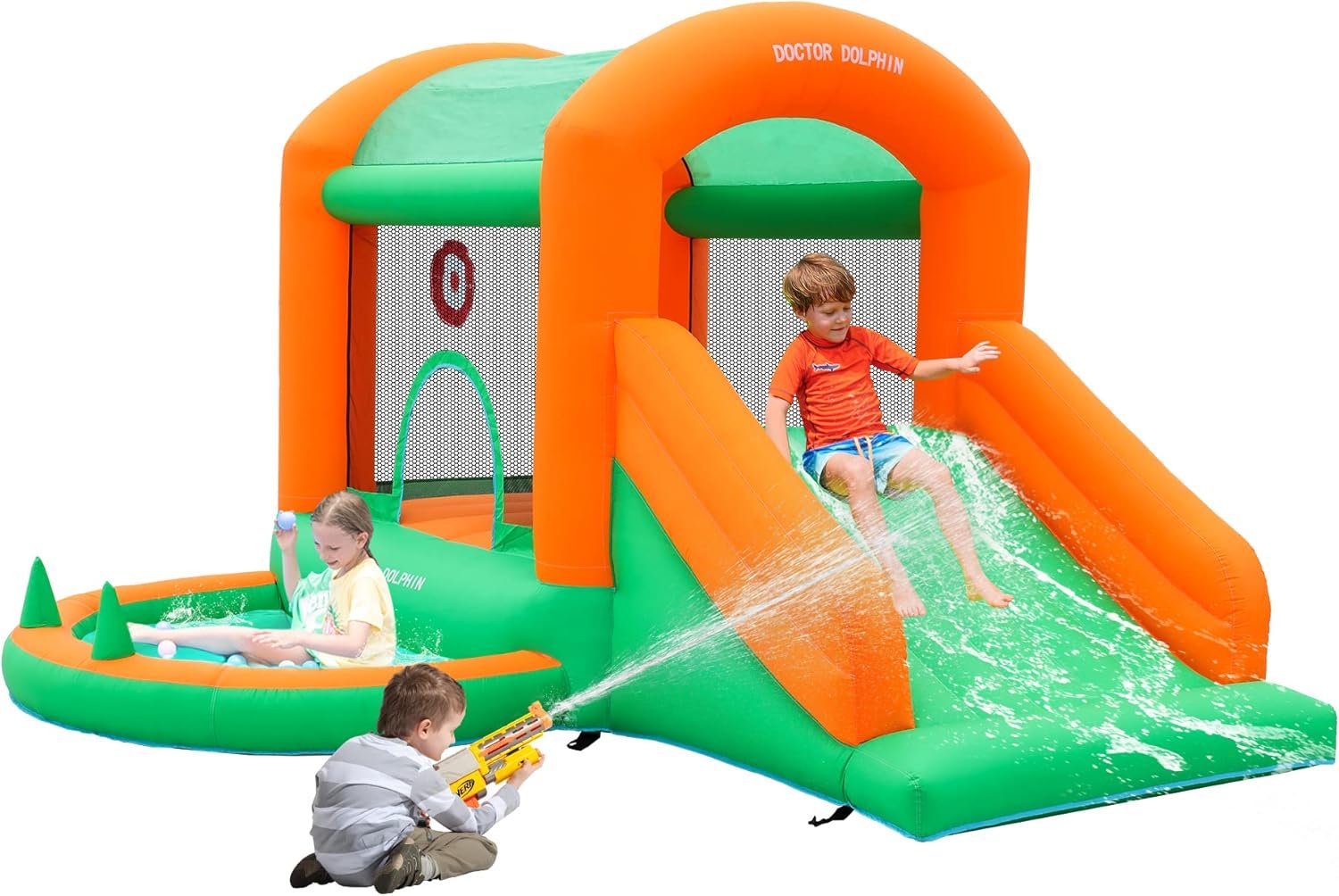 Doctor Dolphin is a leading manufacturer of inflatable bounce houses for homes and water parks, established in 2012. Dedicated to promoting children’s safety and health, their products are designed for enjoyable play experiences. Blow-up bounce houses inflate in just one minute and can be cleaned easily with water. Continuous blower operation is required during use. One popular model accommodates 2-4 children, supports up to 350 lbs, features party lights, an inflatable slide, and a ball pit, making it suitable for various occasions like parties and festivals.