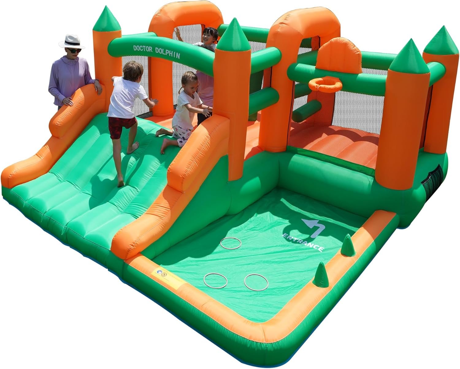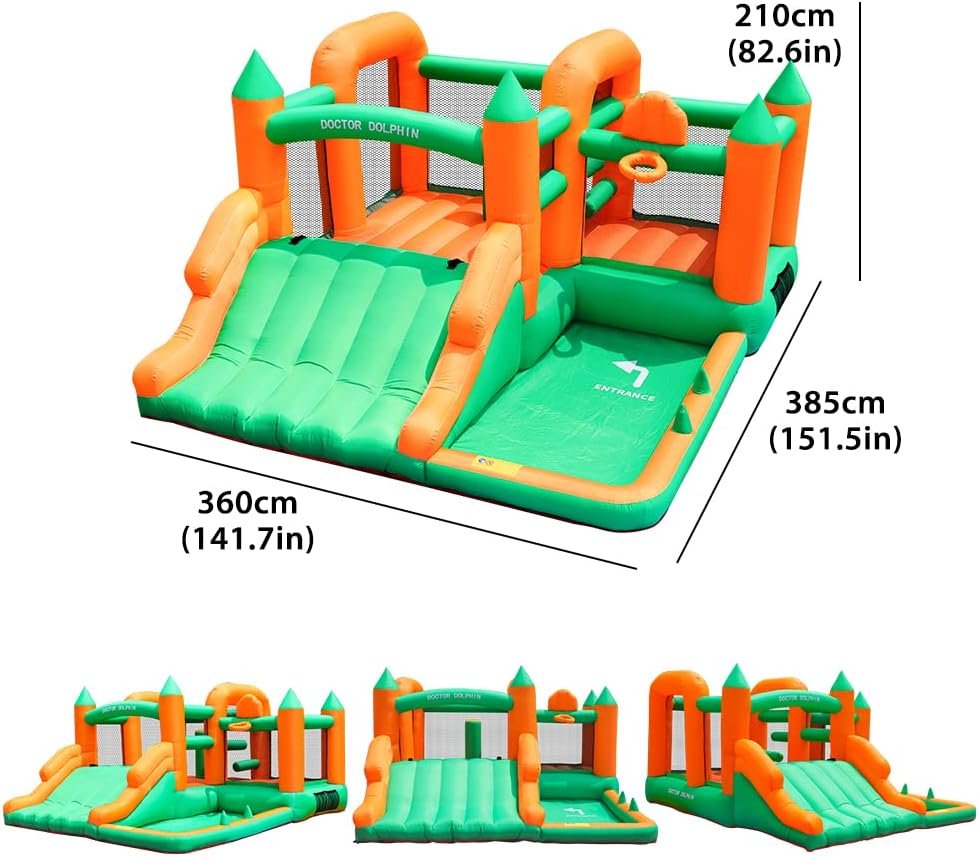 Doctor Dolphin is a leading bounce house manufacturer specializing in inflatable toys for homes and water parks since 2012. Committed to safe play, their products enhance children’s physical and mental health, ensuring a memorable childhood. The inflatable bounce house inflates in one minute and can be easily cleaned with water. While in use, the blower must remain on. Popular features include a spacious design for 4-7 children, mesh walls for safety, a ball pit, a basketball hoop, and a slide, all aimed at maximizing fun and physical activity for kids.