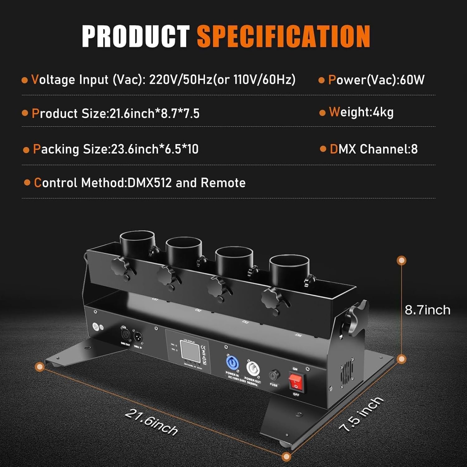 The Professional Electric Confetti Machine offers options for single, two, or four-shot launches, suitable for various events like weddings and concerts. Key features include a customizable angle, DMX control, and a spray height of 6-12 meters, powered by a 150W fan. Its compact design (22.24 x 4.53 x 8.66 inches) ensures portability, while the protective cover enhances reliability. The machine operates via remote control for ease of use. Note that confetti cannons must be purchased separately due to shipping restrictions. Ideal for creating impressive visual displays, it’s a perfect addition to any festive occasion.
