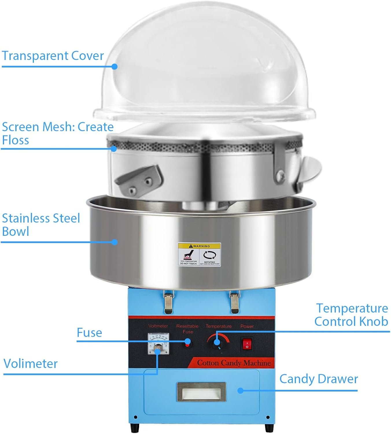 The GarveeTech Electric Cotton Candy Machine combines aesthetic appeal and functionality, perfect for events. Powered by a 1000W heating system, it produces up to six cones per minute and features adjustable temperature control (149-473℉). With an integrated storage drawer, a sugar scoop, and a protective bubble cover, it’s designed for convenience and safety. Ideal for parties and home use, it can handle various sugar types, including flossing sugars and hard candies. Quick to operate, it warms up in 5-6 minutes, making it user-friendly for all experience levels. Price: $171.30 to $202.84.