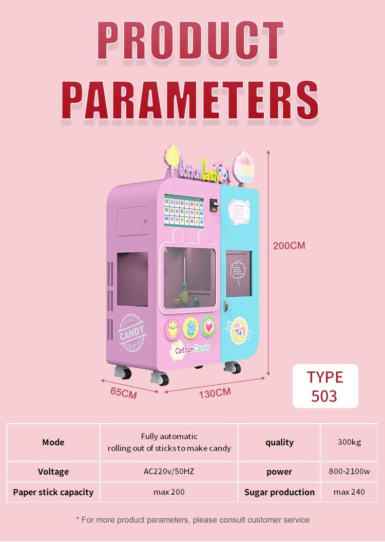 The fully automatic marshmallow machine produces a marshmallow in just two minutes, requiring no manual operation. It uses a manipulator to handle sticks and shape the marshmallows, creating exquisite styles while ensuring excellent taste. The machine features a built-in cleaning function for convenience. Additionally, a commercial-grade cotton candy machine is introduced, designed for large events with powerful electric rotation for quick production. Its user-friendly controls allow for temperature and speed adjustments, while its durable, stainless steel frame makes it easy to clean. Ideal for both commercial and home use, it suits various occasions.