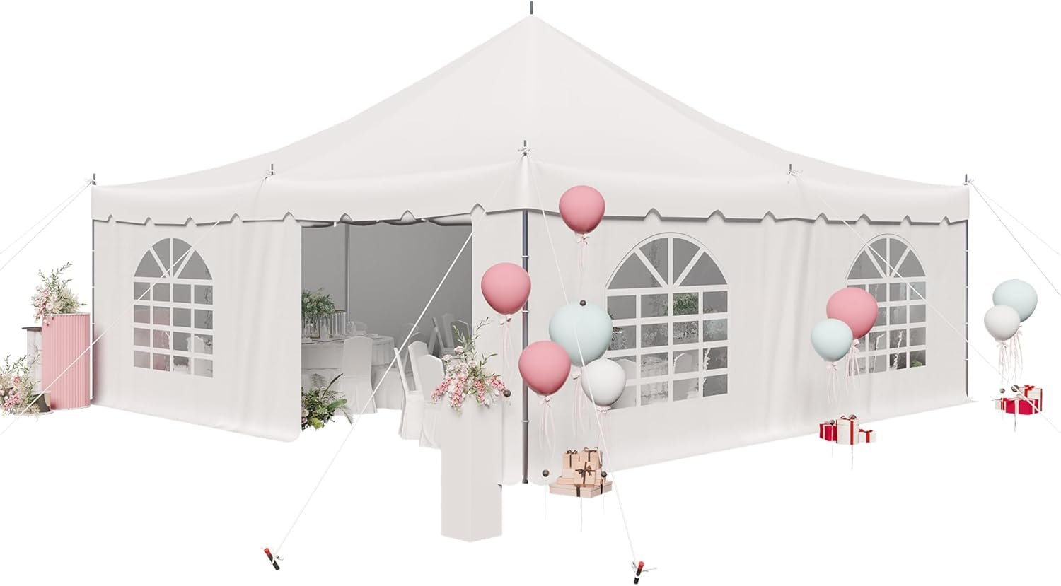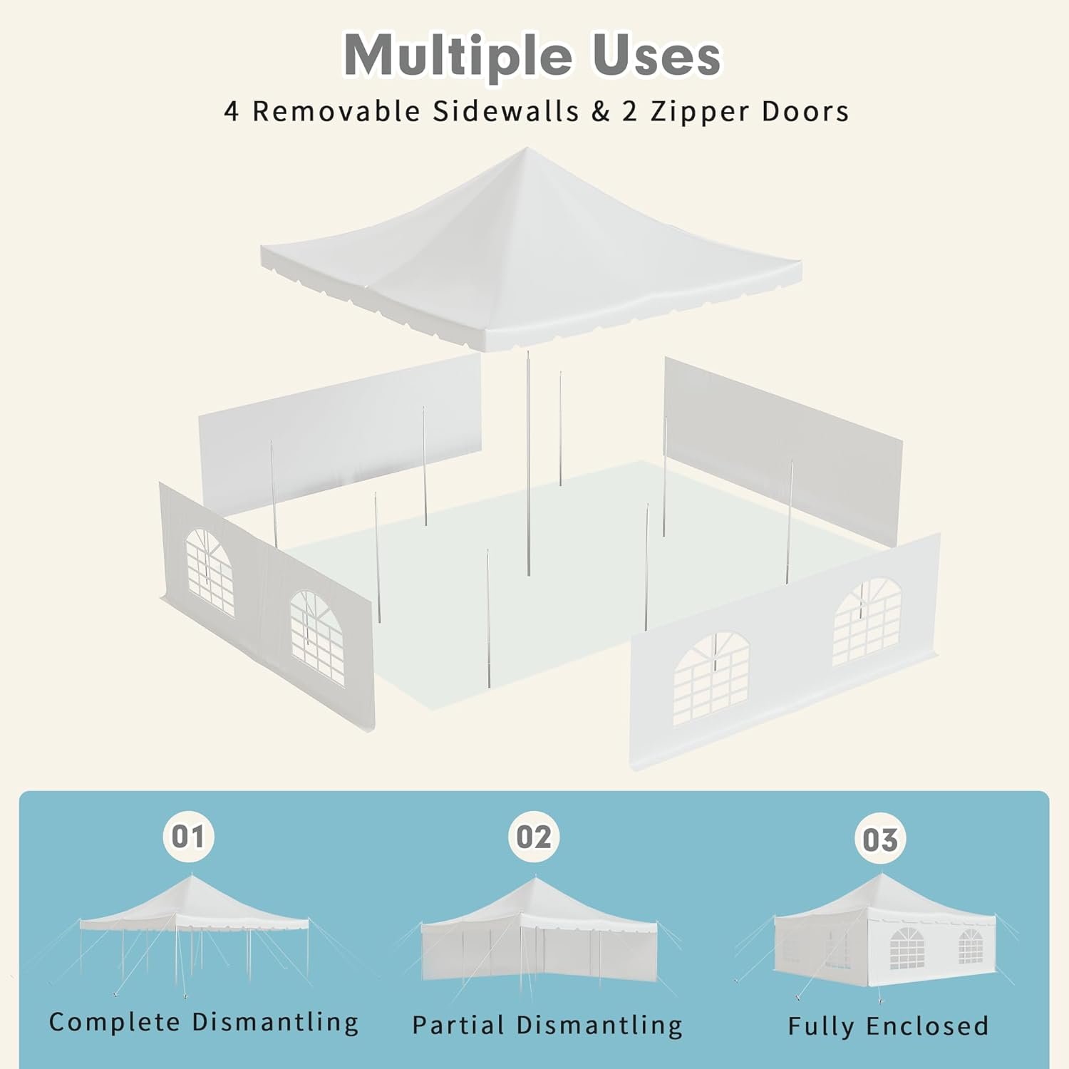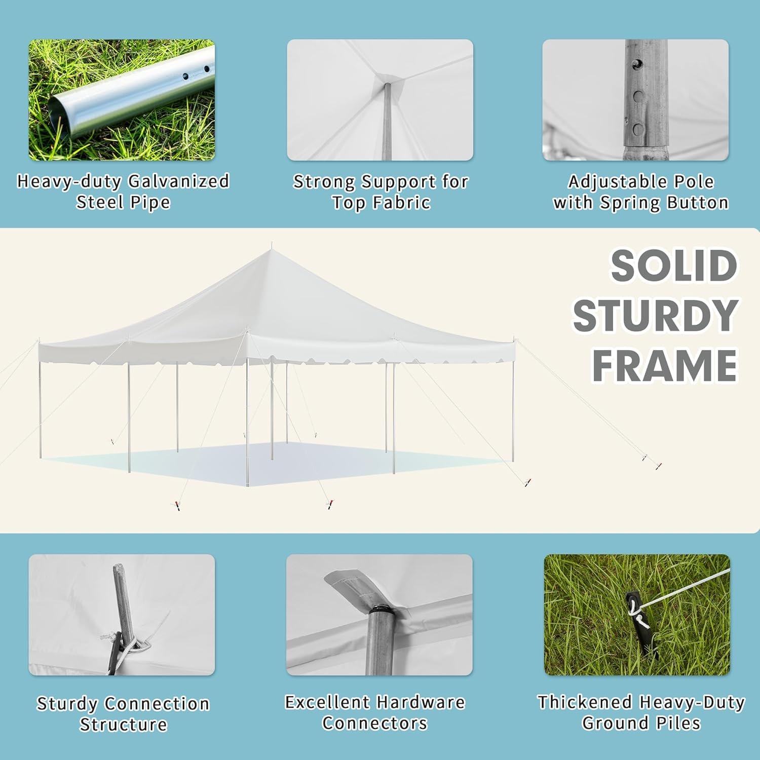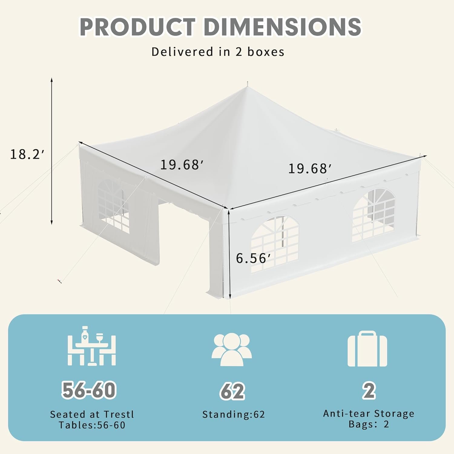 This heavy-duty party tent features reinforced center poles made of galvanized steel for enhanced stability. Constructed with waterproof, UV-resistant, and flame-retardant PVC fabric, it includes five transparent windows and roller shutter doors for ventilation. The tent’s wind protection system consists of thick stakes and cotton ropes for stability. Measuring 20’x20′ and accommodating up to 62 people, it’s suitable for various events. Delivered in two boxes with a carrying bag, it includes assembly instructions and a video for easy setup. Inspect the package upon receipt for completeness; our after-sales team is available for support.