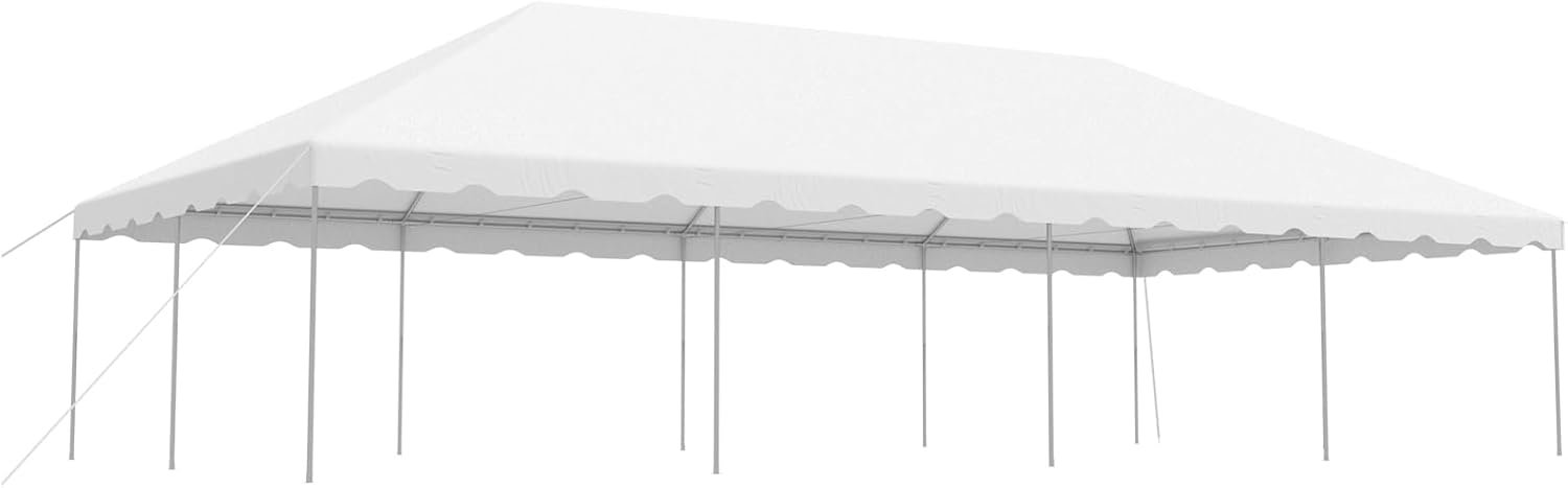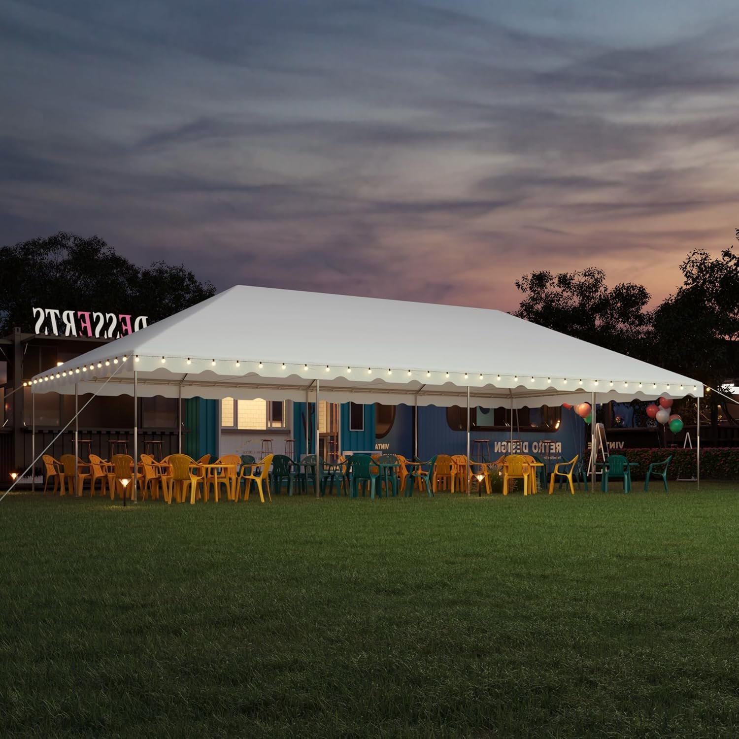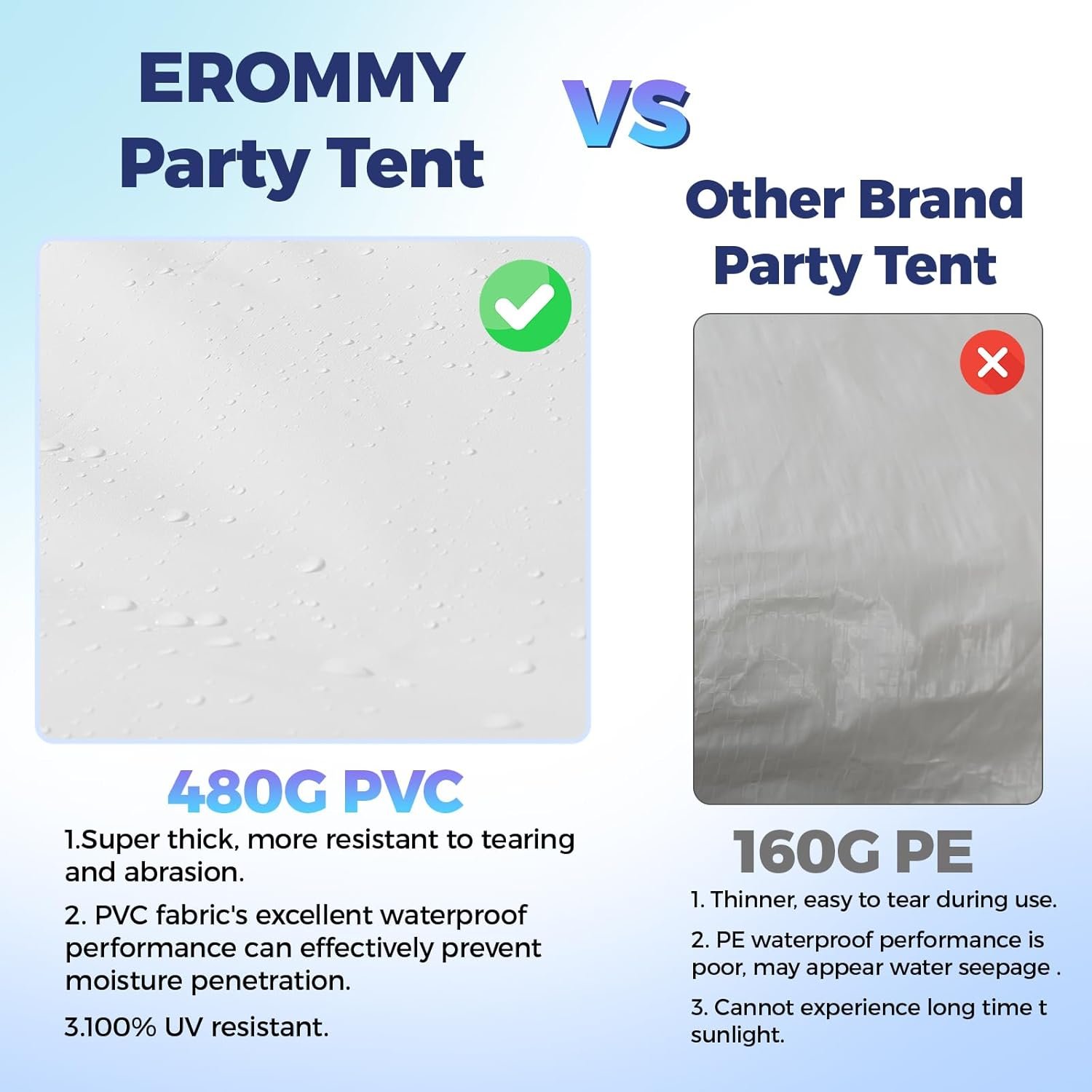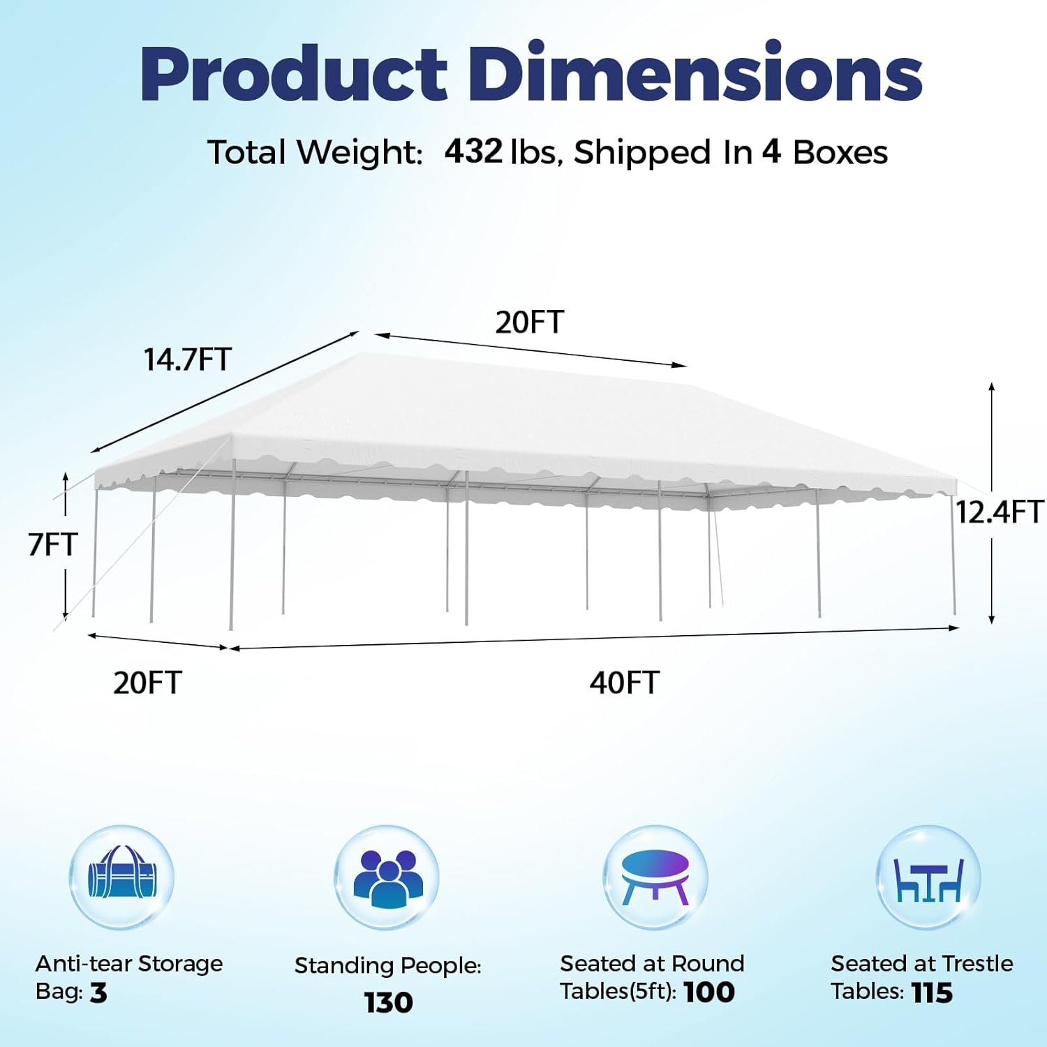 The upgraded heavy-duty party tent features a rust-proof galvanized frame made of 1.5” steel pipes and 1.65” connectors, enhancing durability. Its 480GSM PVC fabric is 100% waterproof, 99% UV-resistant, and tear-resistant. Designed with a wind protection system, it includes wider ropes and strong ground nails, although usage in extreme weather is not recommended. The tent measures 20’Wx40’Lx12.7’H, making it ideal for weddings, parties, and as a carport. Delivered in three boxes with carrying bags, it includes instructions and a video for easy assembly.