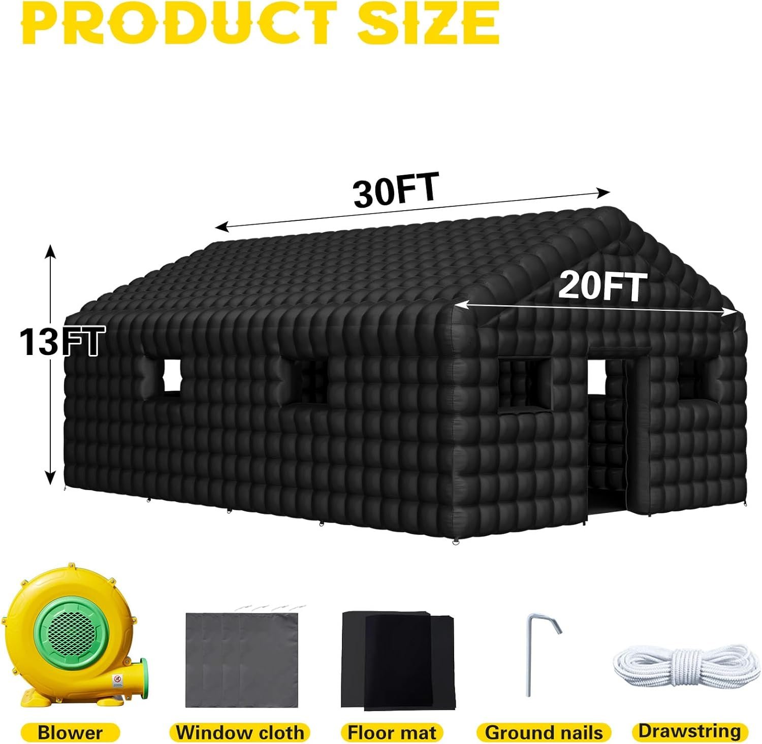The inflatable night club tent measures 30x20x13ft, made from durable 210D Oxford cloth, accommodating at least a dozen adults. It features 8 Velcro windows, a zipper door, and removable mats for comfort. Quick inflation with an 1100W blower makes setup easy.
