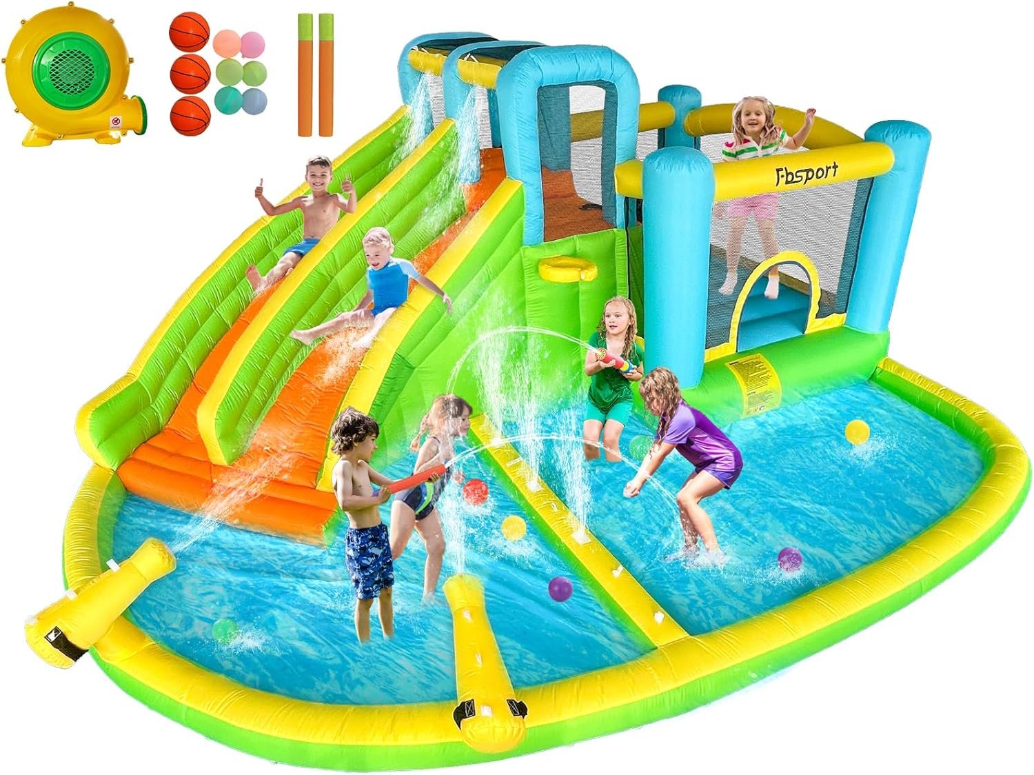 FBSPORT aims to deliver high-quality products globally, aspiring to be a leading brand in the industry. Their 8-in-1 inflatable bounce house features two slides, water guns, sprinklers, a basketball area, a climbing wall, and two splash pools, promoting endless fun. Made from durable materials, it includes safety nets and is easy to inflate and store, measuring 17.9ft x 12ft x 7.2ft. Suitable for 5-8 kids under 100 pounds, it provides both wet and dry play options, making it an ideal year-round gift for children.