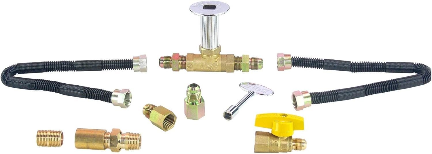 The Flexible Fireplace and Fire Pit connection kit includes a chrome-faced keyed ball valve with two male flared fittings, and two 18″ non-whistle flex lines designed to connect effectively without gas whistles. The CSA-approved lines are flexible, durable, and kink-resistant. The LP version features a Dreffco LP Air Mixer, compatible with male or female burner connections. The kit is designed for easy installation, catering to indoor or outdoor natural gas fire pits or fireplaces with over 200K BTUs, and includes a shut-off valve for gas control and flame height adjustment.