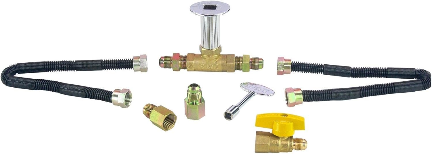 Our Flexible Fireplace and Fire Pit connection kit includes a chrome face keyed ball valve with two male flared fittings and two 18″ non-whistle flex lines. The CSA approved flex lines eliminate gas whistle and won’t kink. Ideal for NG fire pits or fireplaces over 200K BTUs.