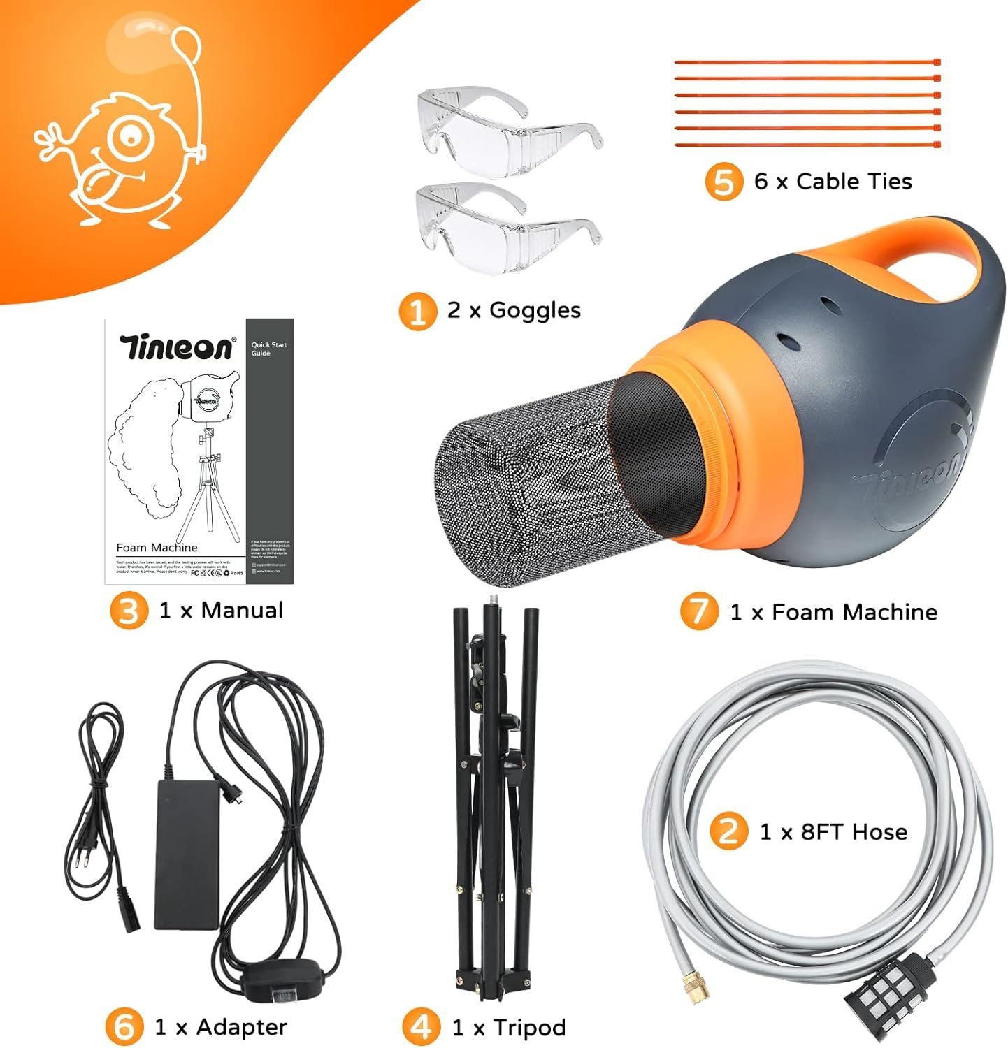 The Tinleon Foam Machine enhances summer fun by creating magical foam for gatherings at beaches, backyards, or pools. Designed for convenience, it sets up in just three minutes and produces large amounts of foam quickly. Weighing only 1.5 kg, it is portable and ideal for various occasions. Safety features include automatic shut-off after 15 minutes of use. The package includes the foam machine, hose, adapter, tripod, goggles, and a user manual, making it easy to enjoy foamy fun with family and friends.