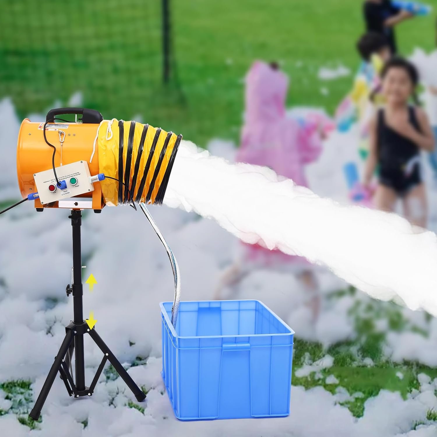 This durable foam machine, made from high-quality iron, features an automatic shutdown for safety and longevity. With a powerful 520W pure copper motor and an air supply of 65m³/min, it produces substantial foam through a fine mesh. The 12-inch fan projects foam up to 19.68 feet, ideal for creating a festive atmosphere at various events such as parties, weddings, and water parks. Its adjustable height stand and rotating capability allow for versatile positioning and foam distribution, making it suitable for gardens, playgrounds, and photography studios.