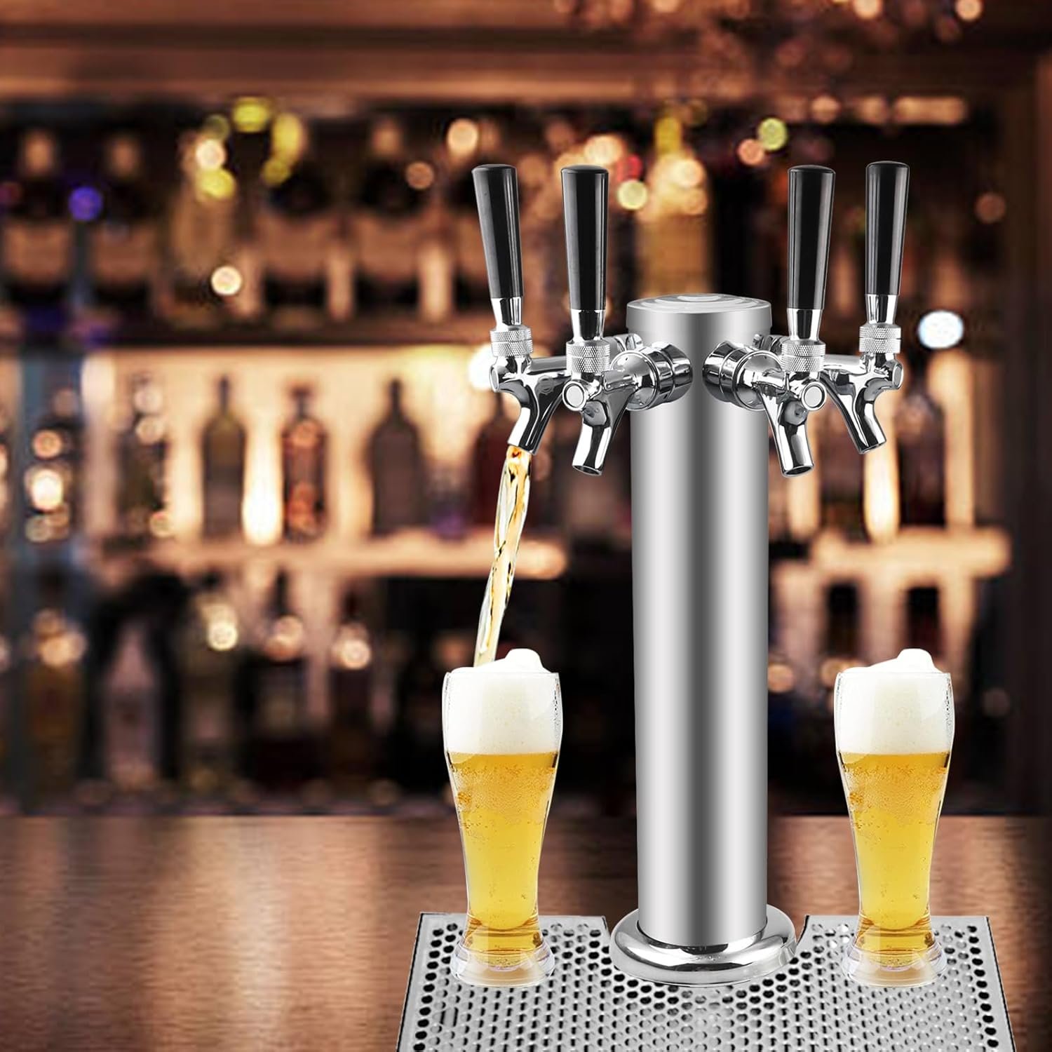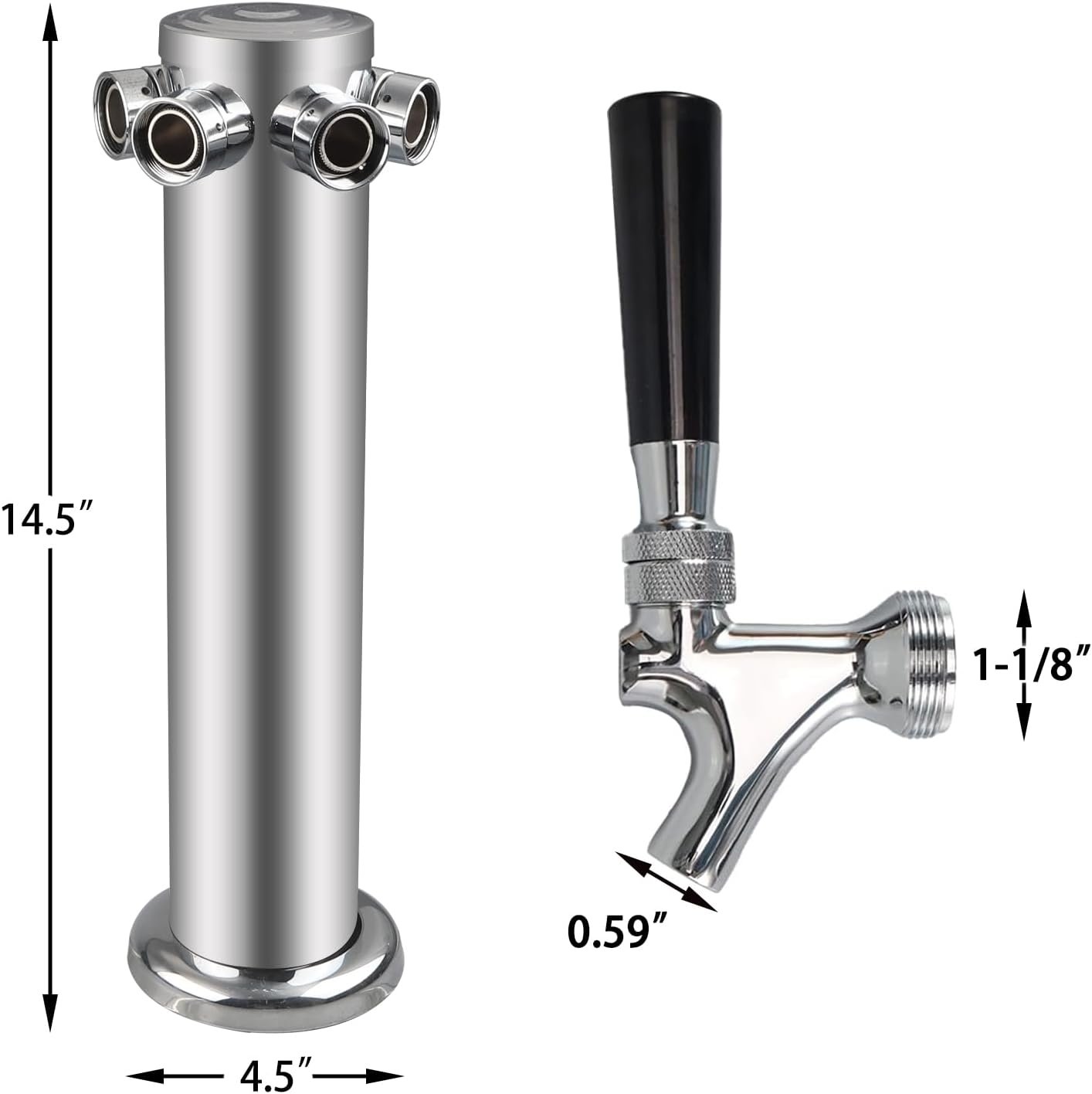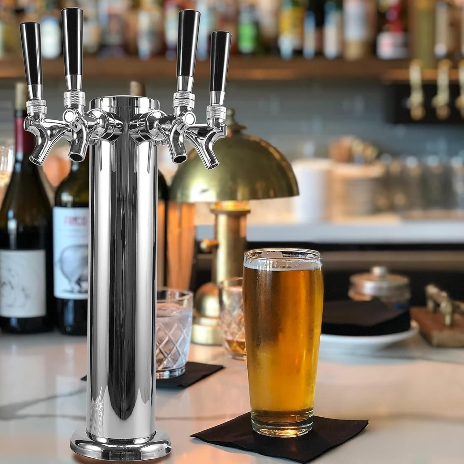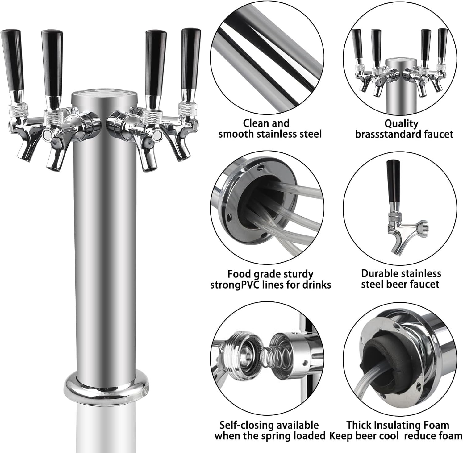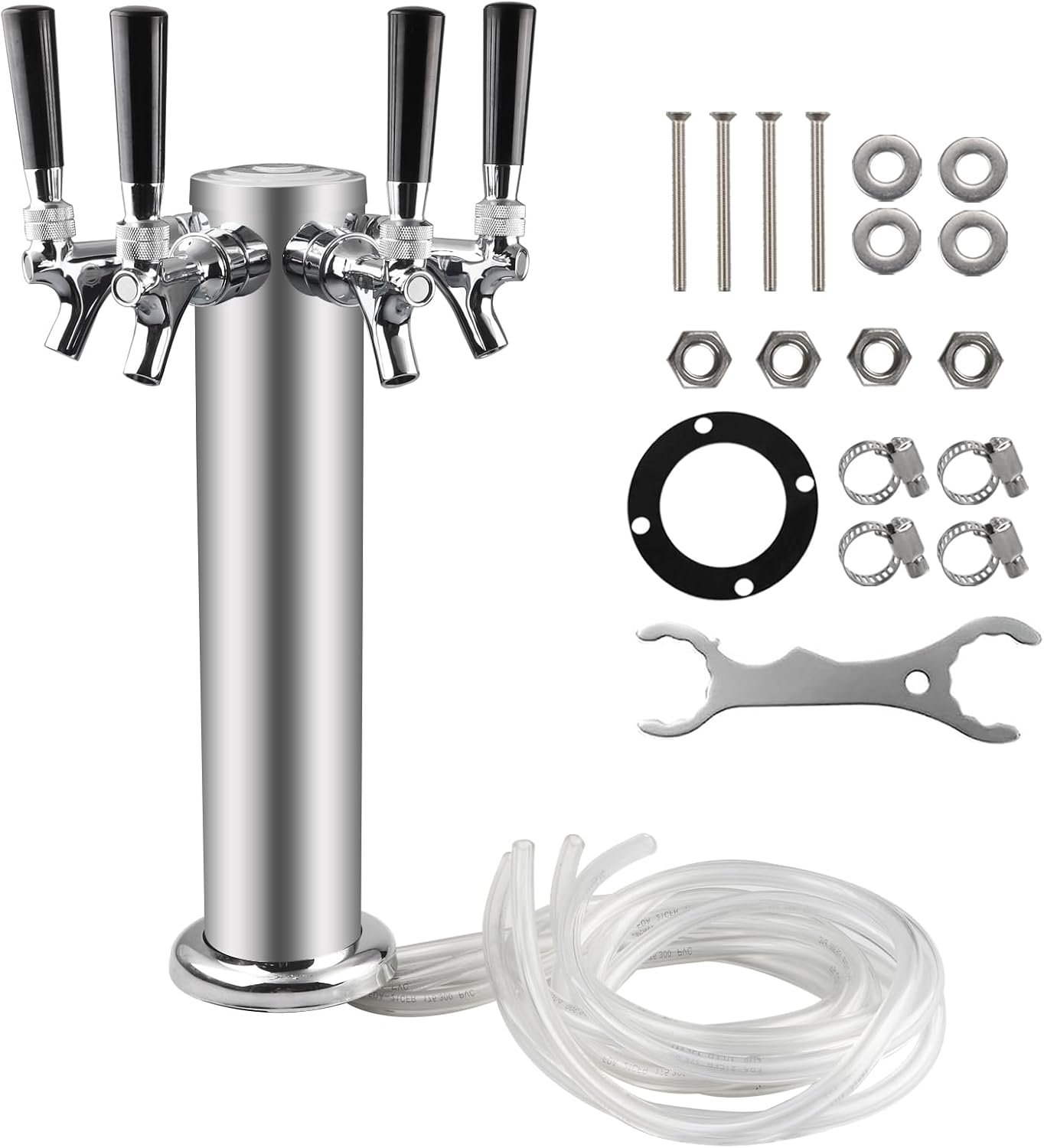 The product is a 3″ diameter Stainless Steel Beer Tower, featuring a durable 304 stainless steel body and chrome-plated brass faucets. It includes four faucet taps, four 3/16” PVC beer tubing, a wrench, and mounting accessories. With dimensions of 17.3″ in height and 4.5″ in base width, it connects to standard keg couplers. Designed for ease of installation, it’s suitable for bars, restaurants, and home brewing. The tower is insulated for cooling and guaranteed for quality, offering a money-back or replacement option if any issues arise. Price: $154.00.