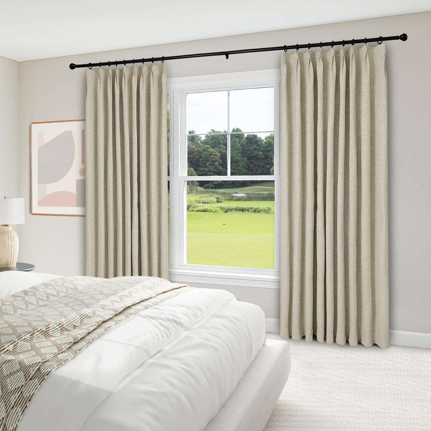 This product is a custom blackout curtain made from 100% linen textured fabric, ensuring complete darkness and privacy. Each package includes one 52-inch-wide panel with nine pleats and a tieback, though rods and rings are not included. The curtains offer exquisite workmanship and a classic look, are machine washable, and easy to care for. They can be tailored to various window heights, allowing for a perfect fit. Plastic hooks for installation are included.