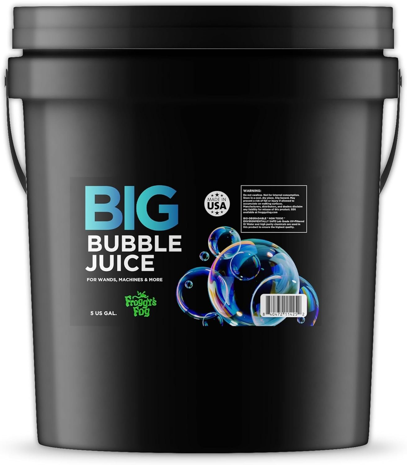Froggy’s Fog Big Bubble Fluid is a 5-gallon, non-toxic solution designed for bubble machines, wands, and blowers. It produces enormous, long-lasting bubbles with a strong exterior shell that allows them to float gracefully for great distances. Manufactured in the USA from high-quality ingredients, this fluid ensures exceptional output and is safe for users. Perfect for creating impressive bubble displays, it’s a top choice for anyone looking to maximize their bubble-making experience.